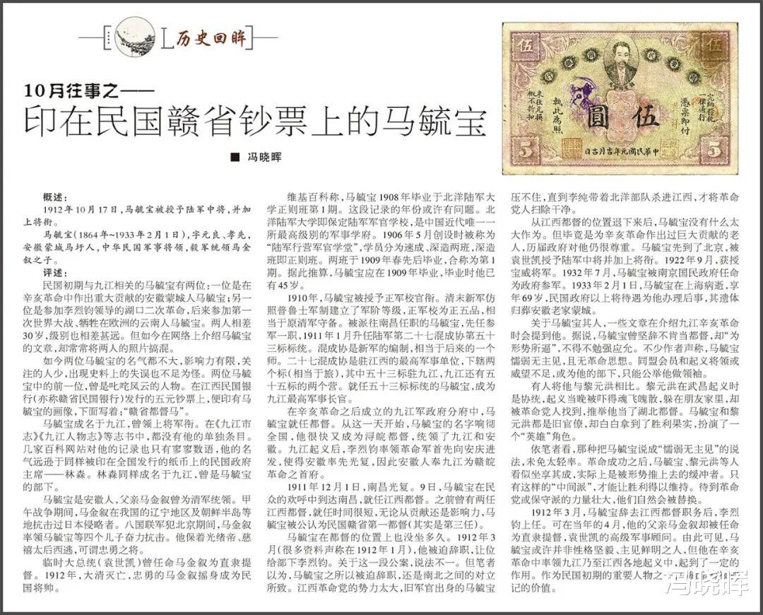本文首发于2025年9月28日《九江日报·长江周刊》总第1044期,名为《印在民国赣省钞票上的马毓宝》,以下为原文。