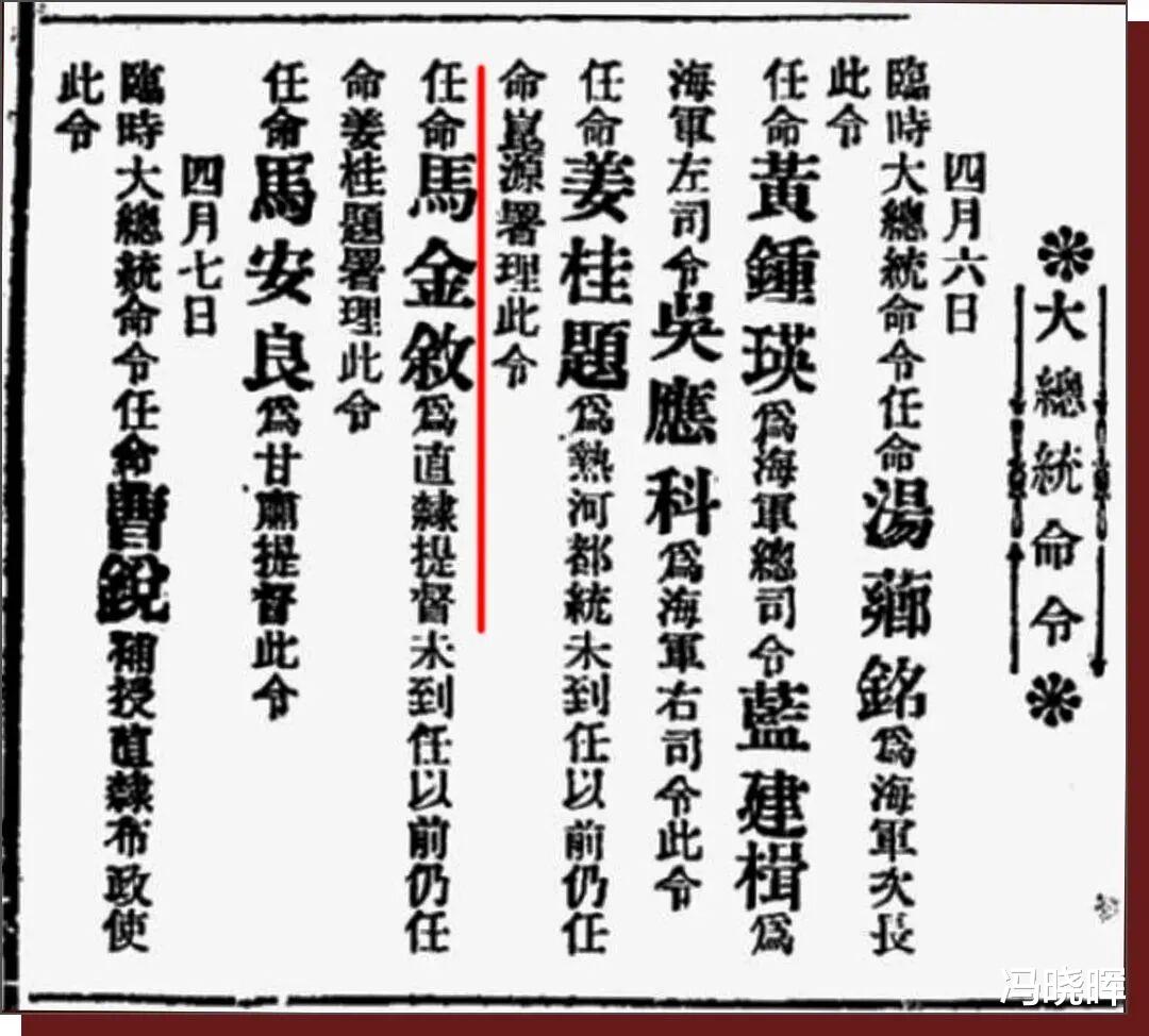 马金叙忠勇么?请看下面这则新闻:临时大总统(袁世凯)任命马金叙为直隶提督。1912年,大清才亡,忠勇的马金叙摇身成为了民国将帅。直隶提督,可不是一般的位置。