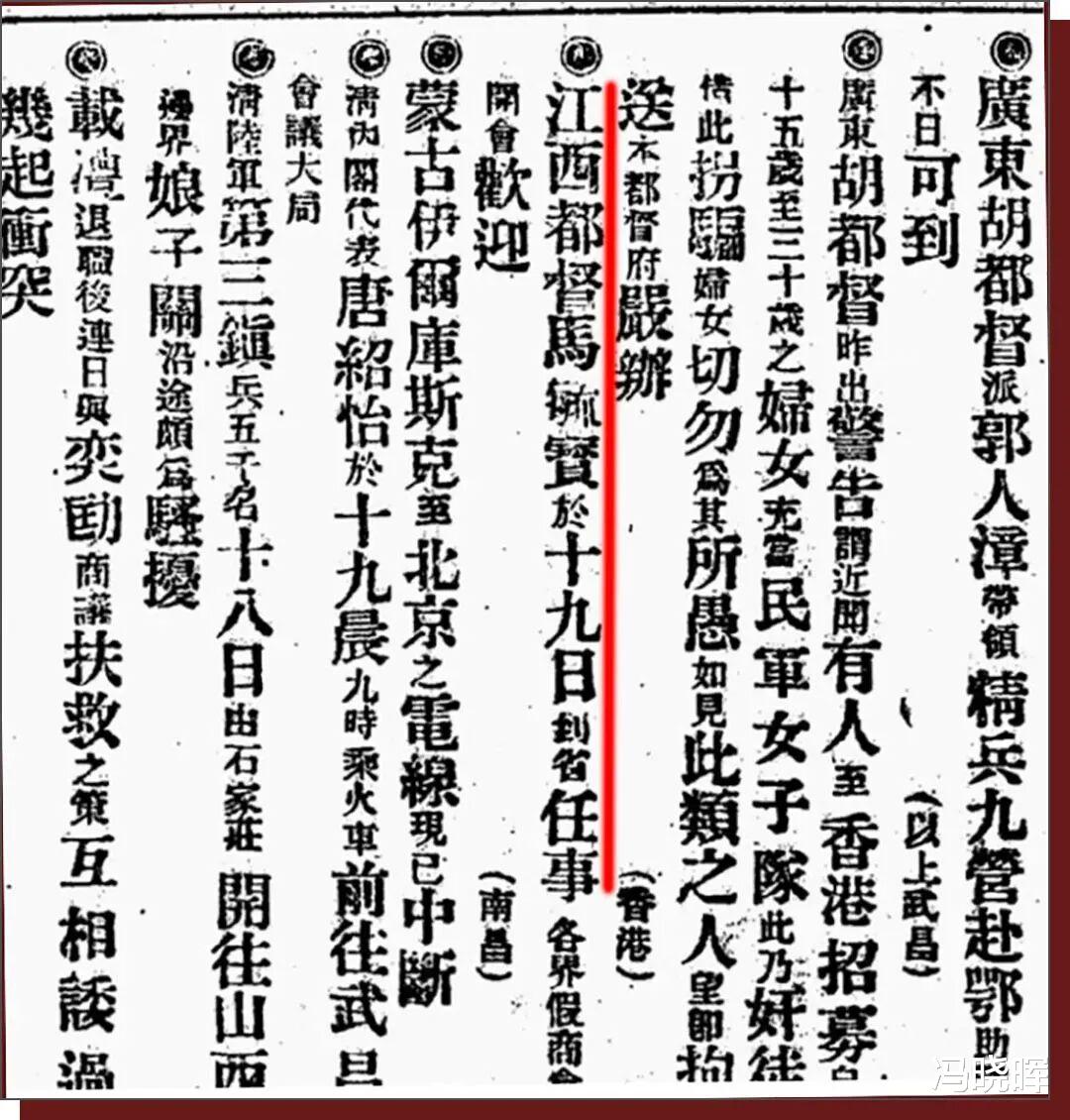 1911年12月1日,南昌光复。9日(上图为阴历,宣统三年十月十九日),马毓宝在民众的欢呼中到达南昌,就任江西都督。之前曾有两任江西都督,就任时间很短,无论从贡献还是影响力,马毓宝被公认为民国赣省第一都督(其实是第三任)。