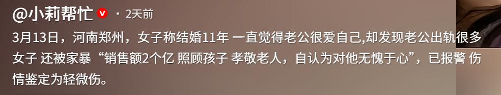 在他看来,男人在外“玩一玩”是天经地义,是你太敏感,是你不懂得这“富人圈子”的规则。这种居高临下的傲慢,比出轨本身更让人恶心。但事情的发展并没有停留在口头的争执,而是迅速升级为了赤裸裸的暴力。