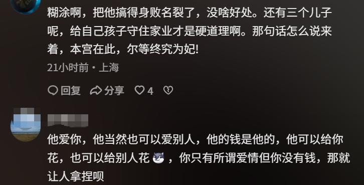 她要给孩子们一个交代,更要给自己一个说法。那种“以前觉得离婚丢人,现在只想要一个公平”的坚定,才是真正的豪门气质,远比那个住着别墅、自封皇帝的男人高贵得多。