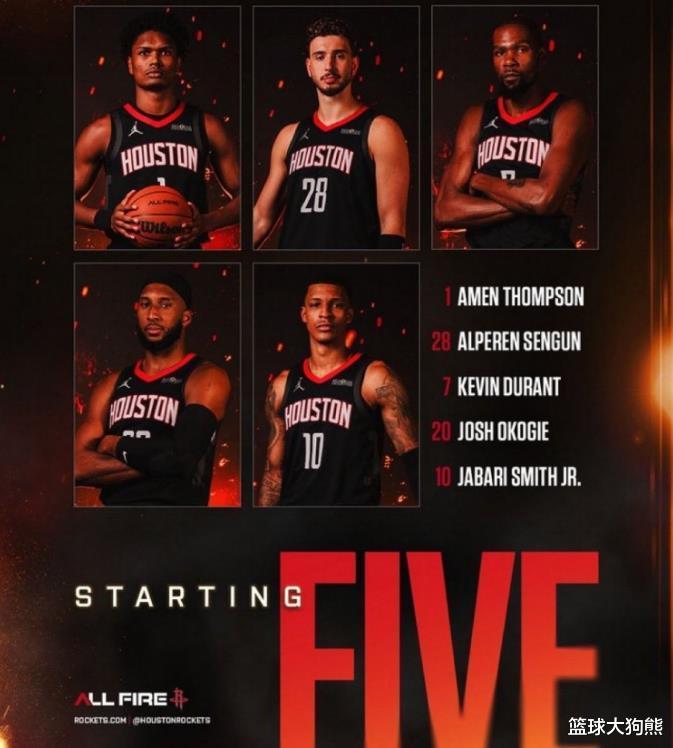火箭队本场的首发阵容分别是阿门·汤普森、奥科吉、杜兰特、小史密斯和申京,和前一场没有什么变化。但第二阵容有一些调整,5位球员出战,分别是后卫谢泼德、戴维森,以及前锋多利安·芬尼-史密斯、泰特和中锋卡佩拉。两套阵容看起来非常齐整。