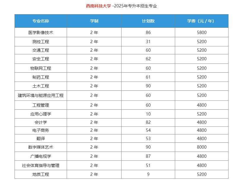 2025 年西南科技大学专升本招生设置 17 个专业,覆盖工学、医学、管理学、文学、教育学、艺术学等类别,所有专业学制均为 2 年,总计划招生超 1000 人,其中数字媒体艺术、土木工程专业招生90人,广播电视学招生87人,医学影像技术86人、会计学82人,其余专业人数都在80以下,最少的是地质工程,只有9人。