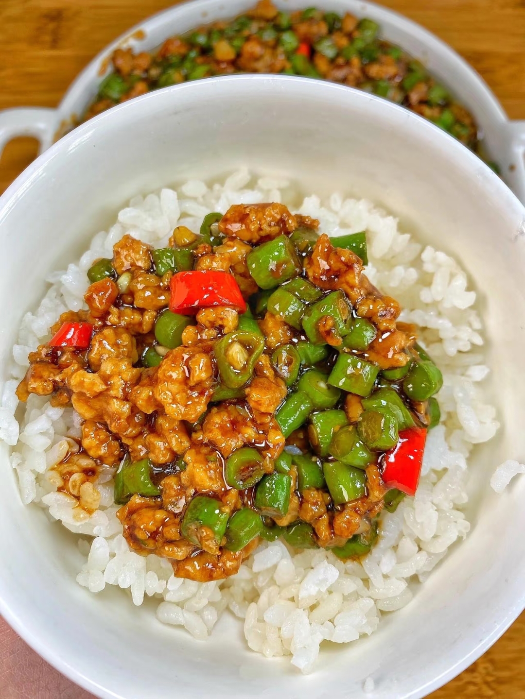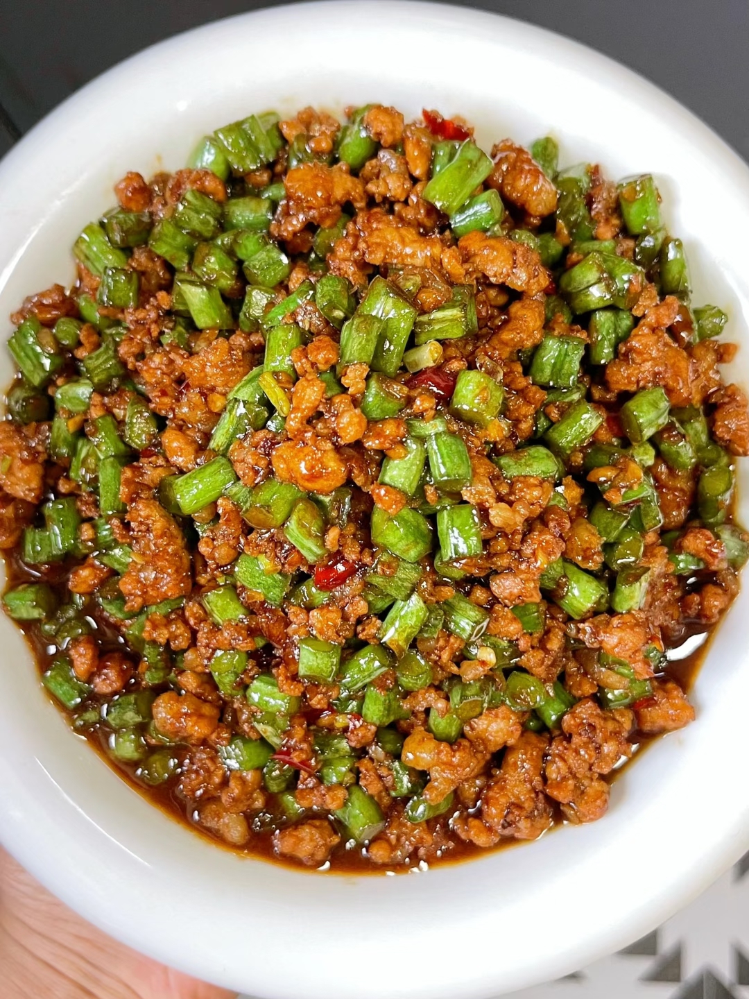 锅里留少许底油,倒入焯好的豇豆角,中火翻炒至表面微微起皱(这是脆嫩的关键!)。接着把炒好的肉沫倒回锅里,和豇豆角一起翻炒,让每一根豆角都裹上肉沫的酱汁。最后尝一口咸淡,适量加盐调味,关火前撒点鸡精(可选),一盘“米饭杀手”就大功告成!