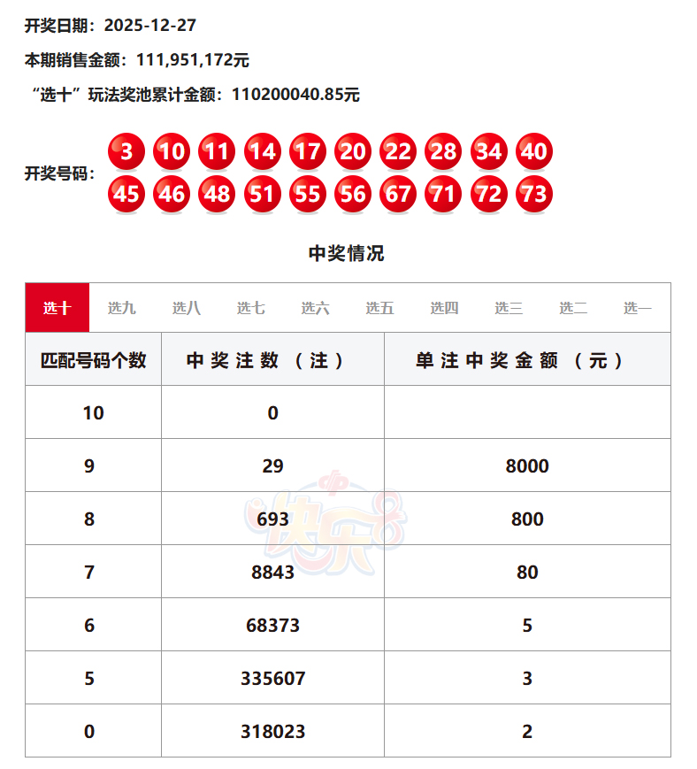 三连号:71、72、73(大号区末端密集)两连号:45、46(中号区衔接)近号组合:10与11(间隔1)连号在快乐8开奖中较为常见,通常每期会出现1-3组。本期三连号出现在70+区域,较为醒目。历史数据显示,70以上区域出现三连号的频率约为每10期1-2次。