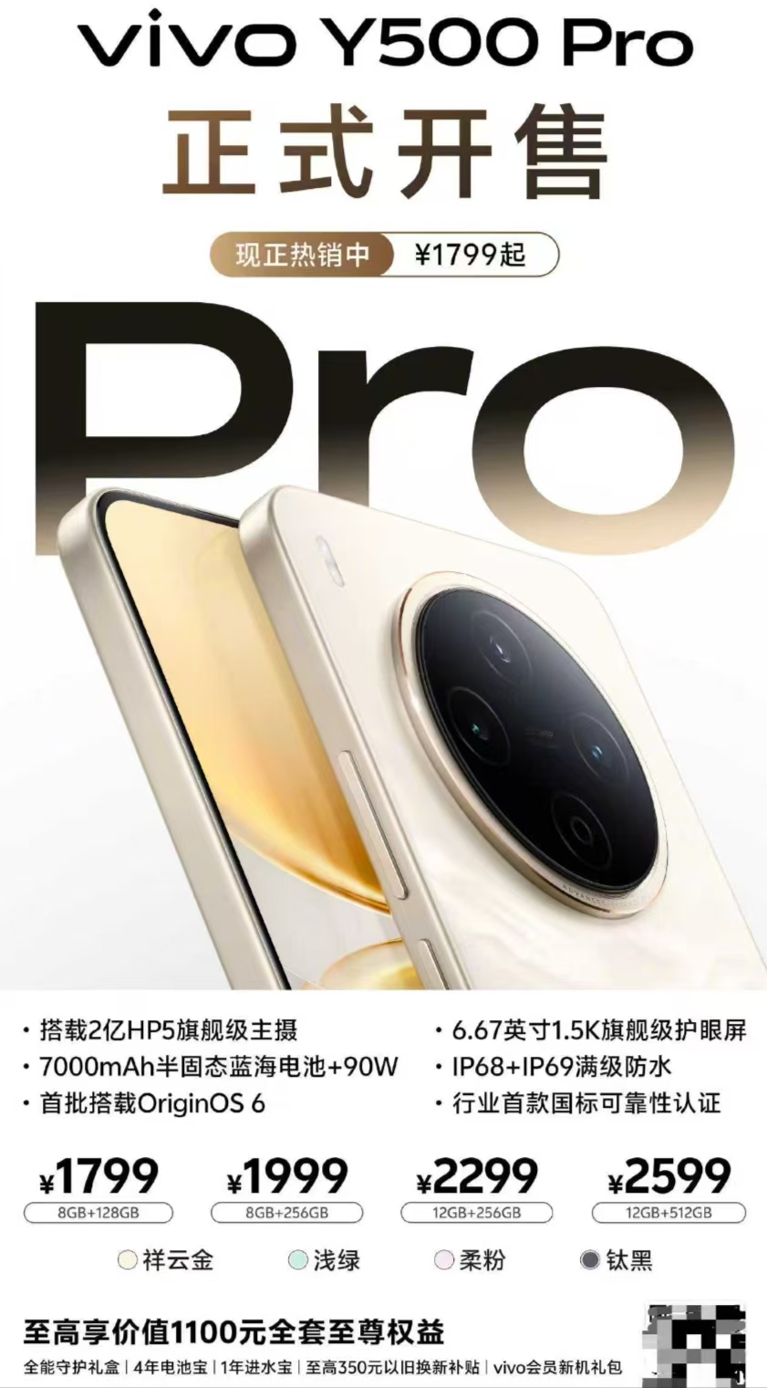 11月,vivo正式推出全新Y系列旗舰——vivo Y500 Pro,并宣布这款新机正式开售。售价1799元起,国补优惠至高立减389.85元。预售及首销期间购机还可享至高1100元好礼,包括全能守护礼盒、4年电池宝、1年进水宝、会员礼包等,至高6期免息、以旧换新补贴350元,为用户带来超值购机体验。