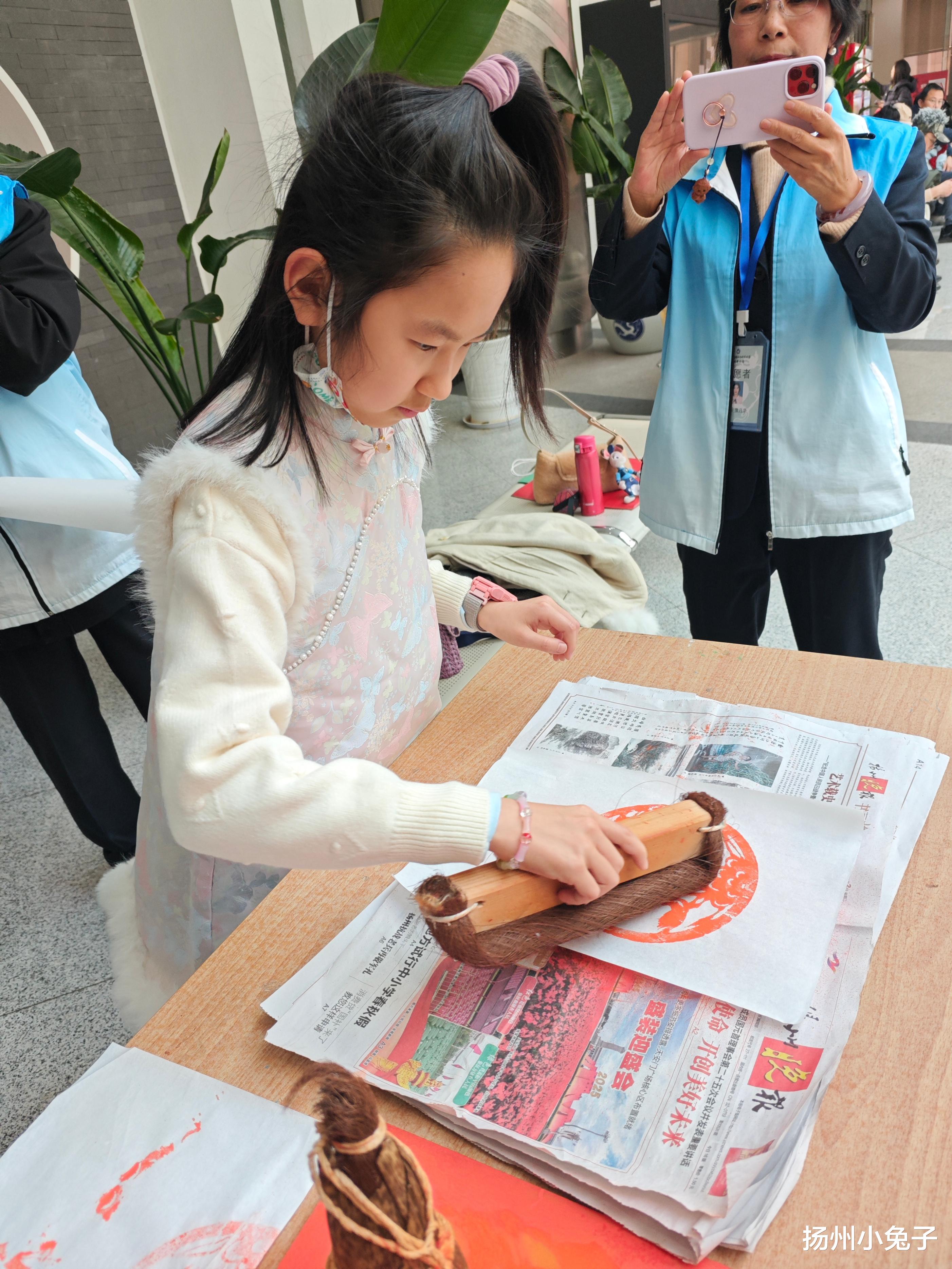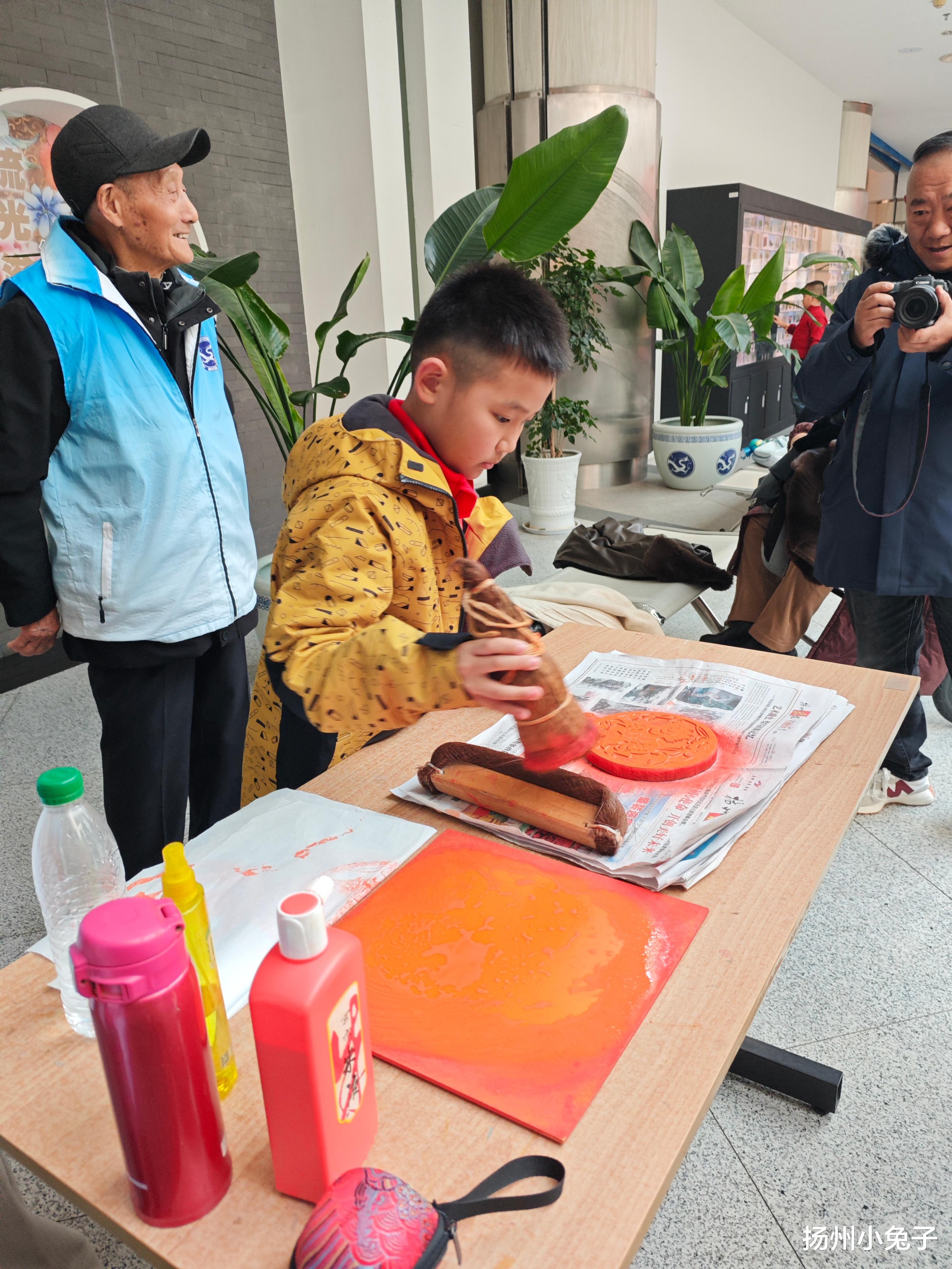 节目在准备中始。侧面有一支小队伍排着。去看看。先到队伍最顶端,弄清楚为什么排。原来,春节期间的体验项目。游客自己用雕版印刷一张马!顺着队伍看到,是年轻父母带孩子玩。还有几个青年人排着。