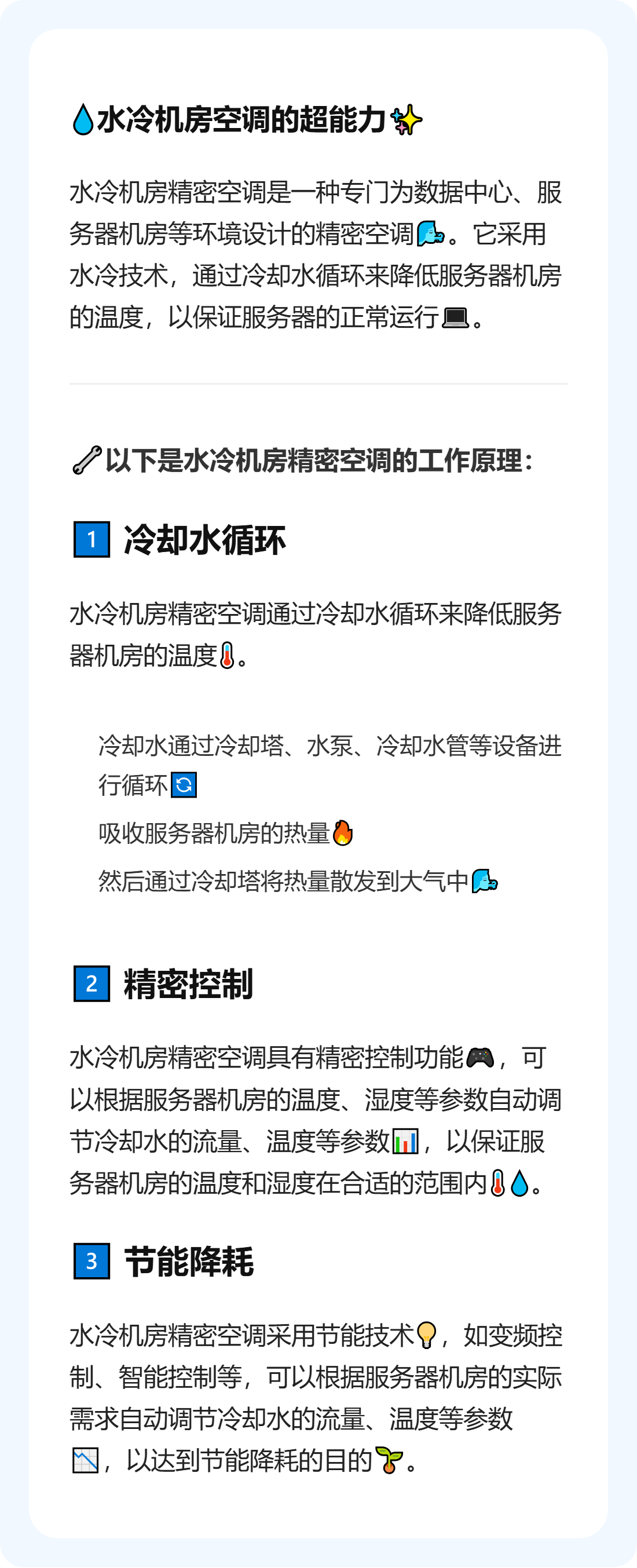 ✅ 超精准控温:自带“智能大脑”,能实时监测机房的温度、湿度,自动调节冷却水的流量和温度,误差控制在±1℃以内,让服务器始终处在最舒适的运行环境,杜绝因温湿度波动出问题。