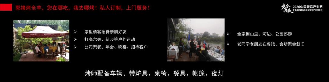 在模式设置上,不同于传统模式让顾客来找产品,郭靖烤全羊打造了一个全新模式,主打让产品和服务去找人。具体而言,无论室内宴请,还是户外活动等场景,我们的烤师都能配备专用车辆,携带羊、炉具、桌椅、餐具、帐篷、夜灯等设备提供上门服务。