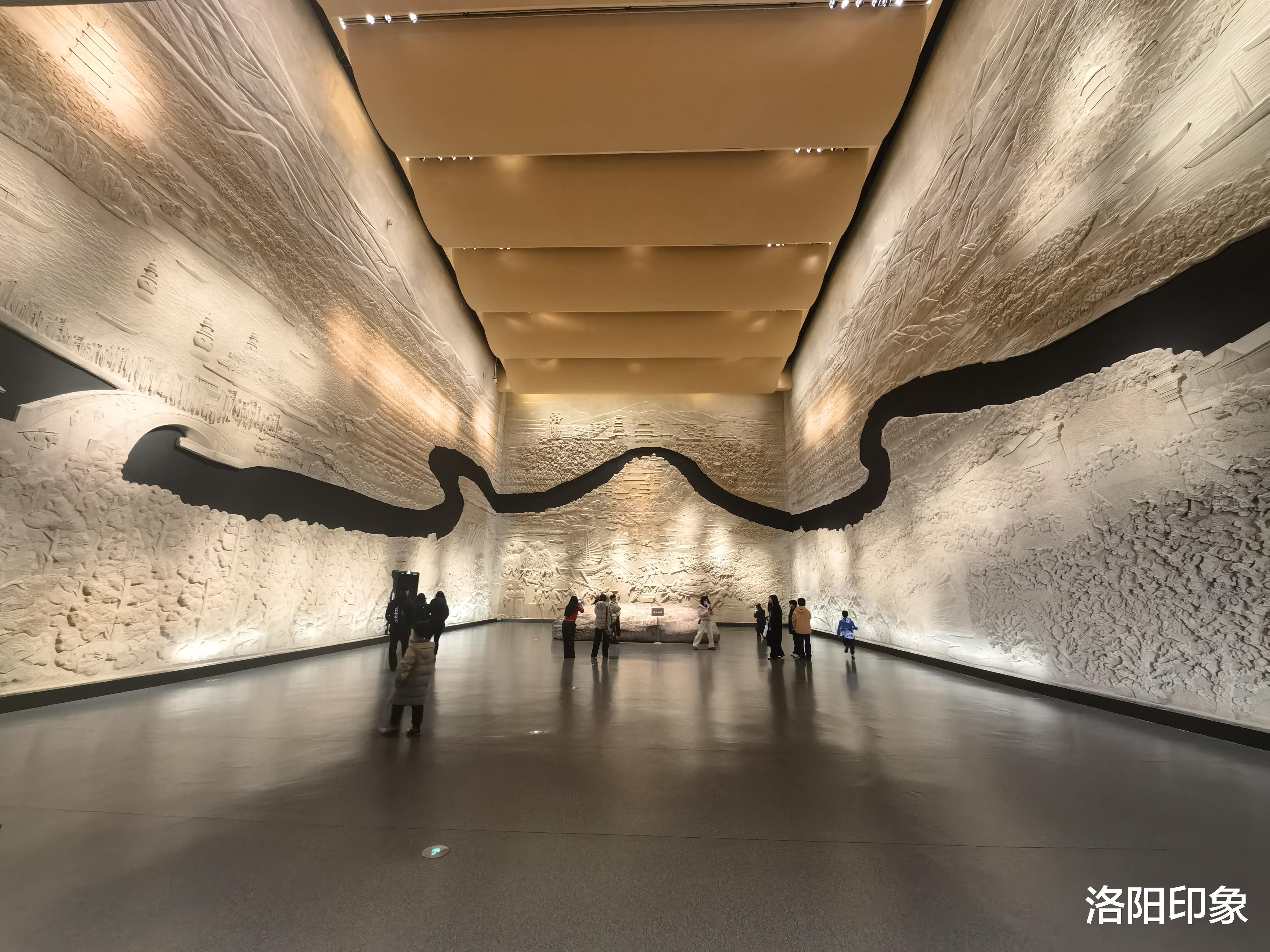 除了这些珍贵文物,博物馆的特色展项也十分吸睛。由近13万块唐三彩陶瓷片组成的《云帆》吊顶,是世界上最大的陶瓷吊顶艺术作品,光影流转间,就像运河上的碧波在涌动,尽显大唐风华;长达25米的汴河河道剖面,直观展示了千年地层的堆积,层层叠叠的土层中,藏着运河的变迁和洛阳的历史印记;三层的“一粒米的漕运之旅”互动展,更是趣味性十足,通过3D动画和互动游戏,让你化身“漕工”,亲身感受粮食从征收、运输到归仓的全过程,既能玩得开心,又能学到知识。