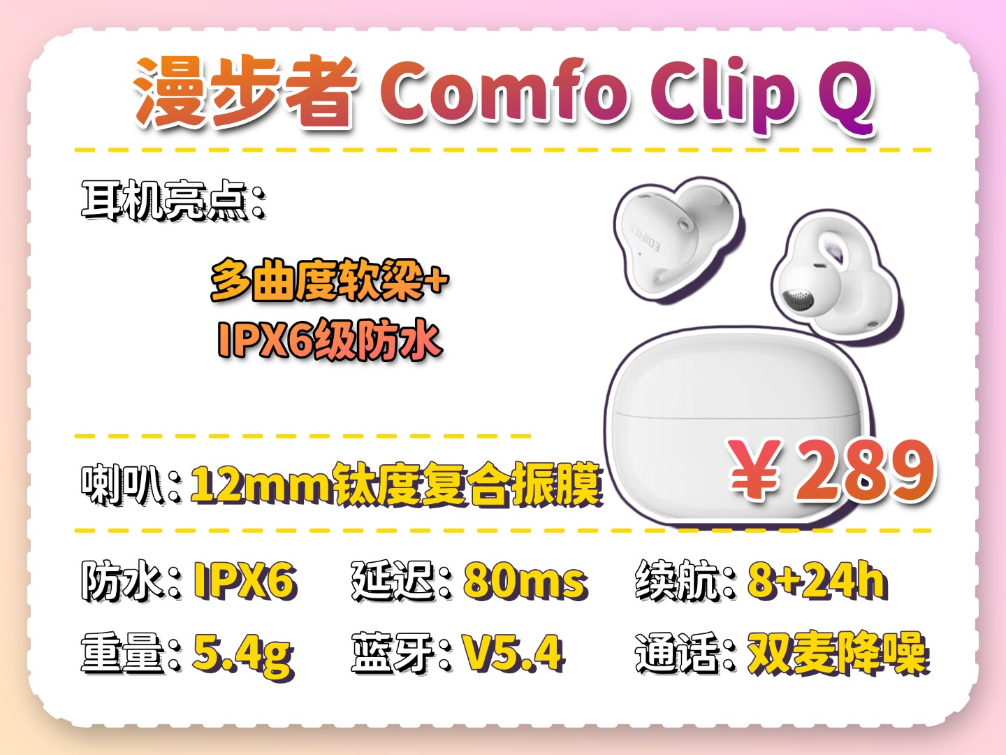 漫步者Comfo Clip Q在佩戴上采用小圆头与多曲度软梁设计,能温和包裹耳部轮廓,机身重量平衡,长时间使用舒适感良好。音质上配备钛度复合振膜,声音表现清晰,但整体听感较为普通,且在音量较大时存在可察觉的漏音。性能上具备高强度防水,无惧汗水和雨水,支持一拖二连接与清晰通话降噪,续航可满足全天通勤需求。虽然音质和防漏音能力较为一般,但它的佩戴体验舒适、防水性能可靠,是日常场景中侧重实用与佩戴感的选择。