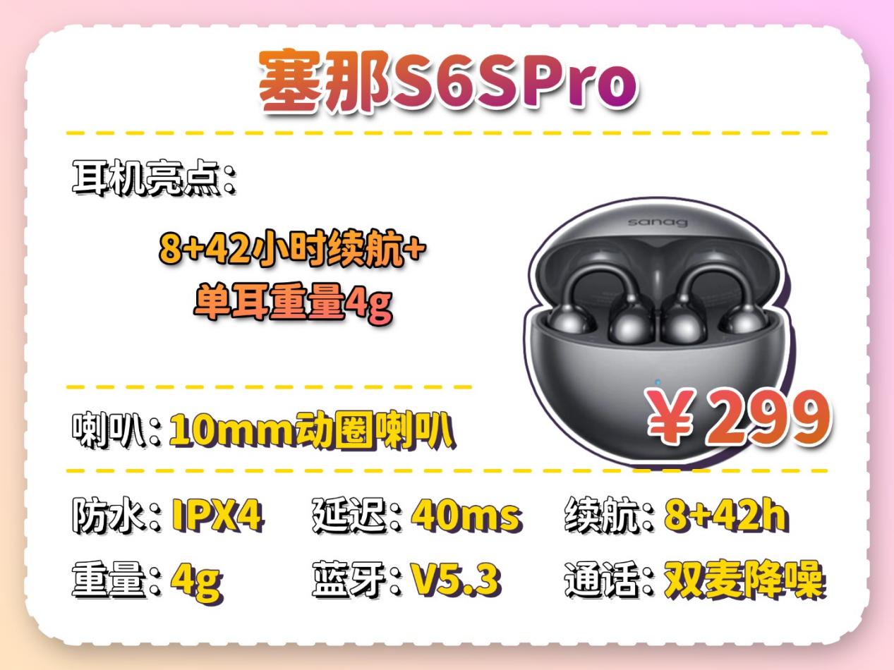 塞那S6SPro在佩戴上采用C形桥与贴合耳廓的设计,机身极为轻巧,长时间使用几乎感觉不到负担。音质上依靠动圈单元与全景音增强技术,声音开阔自然,能满足日常听歌看视频的需求,但整体表现中规中矩。性能上支持低延迟的游戏模式,具备生活防水和清晰通话降噪,而且续航特别持久,不用频繁充电,不过它不支持一拖二连接。虽然它的音质和性价比不算突出,但它的超轻佩戴和超长续航表现,是追求极致轻便和续航能力的用户的实用选择。