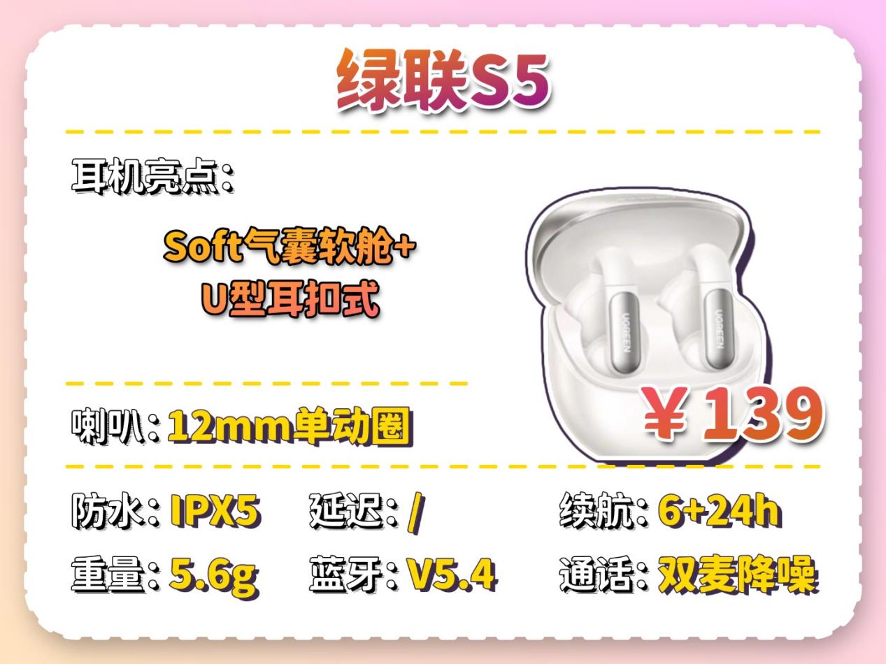 绿联S5在佩戴上采用Soft气囊软舱与U型耳扣设计,能温和包裹耳廓,戴起来轻盈且贴合稳固,长时间使用舒适感良好。音质上搭载动圈单元与低频增强算法,声音表现清晰饱满,日常听歌够用,但整体细节相对一般。性能上具备日常防水与清晰通话降噪,连接稳定,不过单次续航时间较短。虽然它的音质和续航表现不算突出,但舒适的佩戴体验与亲民的价格,是百元价位内注重佩戴感的入门级选择。