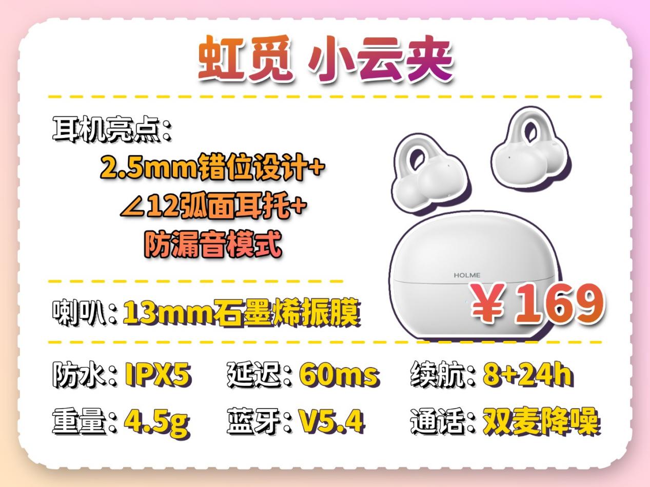 虹觅小云夹在佩戴上采用错位设计与弧面耳托,能温和贴合耳廓,结合轻巧机身,长时间使用依然舒适。音质上配备石墨烯振膜与全景空间音效,让声音细节更清晰,更有层次,加上实验室的专业调音,不对声音过渡修饰,整体听感均衡自然。性能上支持实用的防漏音模式与双设备连接,具备日常防水与通话降噪,续航可满足全天使用。虽然其设计较为简洁,但它的佩戴非常舒适稳固,而且防漏音的效果很好,是百元价位耳夹中兼顾实用与舒适的全能型耳夹耳机。