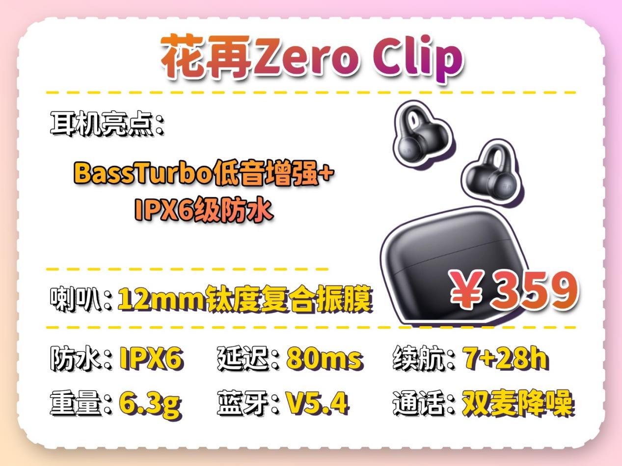 花再Zero Clip在佩戴上采用C形桥与12度夹角设计,贴合感强且不易掉落,但耳机偏重,长时间使用舒适度会受影响。音质上配备钛度复合振膜与低音增强引擎,声音饱满有力,低音表现突出,不过音量较大时漏音较明显。性能上具备高等级防水,无惧汗水雨水,支持一拖二连接和清晰通话降噪,但单次续航相对较短。虽然它在重量、漏音和续航上存在不足,但它的音质扎实、防水出色且佩戴稳固,是运动通勤场景中兼顾防护与听感的实用选择。