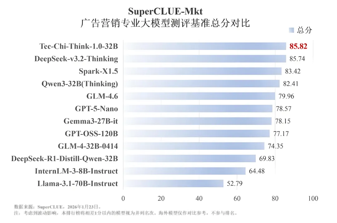 而让Navos能够清晰、准确感知全球市场脉搏的,是其强大的 “神经系统”——钛极大模型。作为Navos的“智能中枢”,该模型的学习与优化源于超10万广告主的实战反馈所形成的可归因商业数据,这包括钛动科技覆盖全球200多个国家和地区和累计管理超4亿条策略的行业Know-How。在专业中文大模型测评机构SuperCLUE发布《广告营销专业大模型测评基准榜单》中,钛动科技自研的Tec-Chi-Think-1.0-32B(中文名:钛极问答推理模型)以总分85.82的成绩强势登顶,在专业领域内真正超越顶流的通用AI模型。