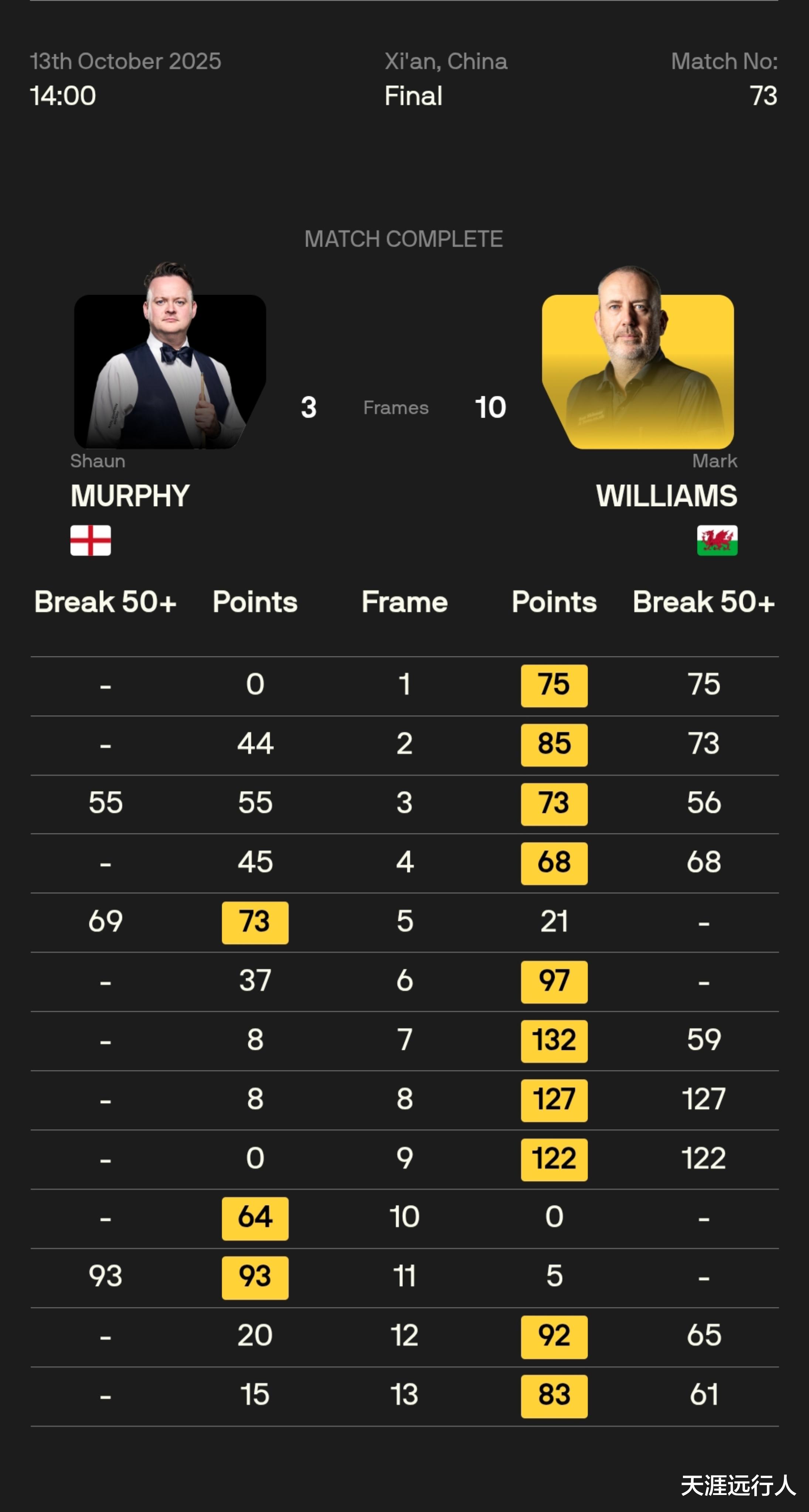 马克·威廉姆斯127、122分打出两杆破百和75、73、56、68、59、65、61分七杆50+,肖恩·墨菲打出55、69、93分三杆50+;