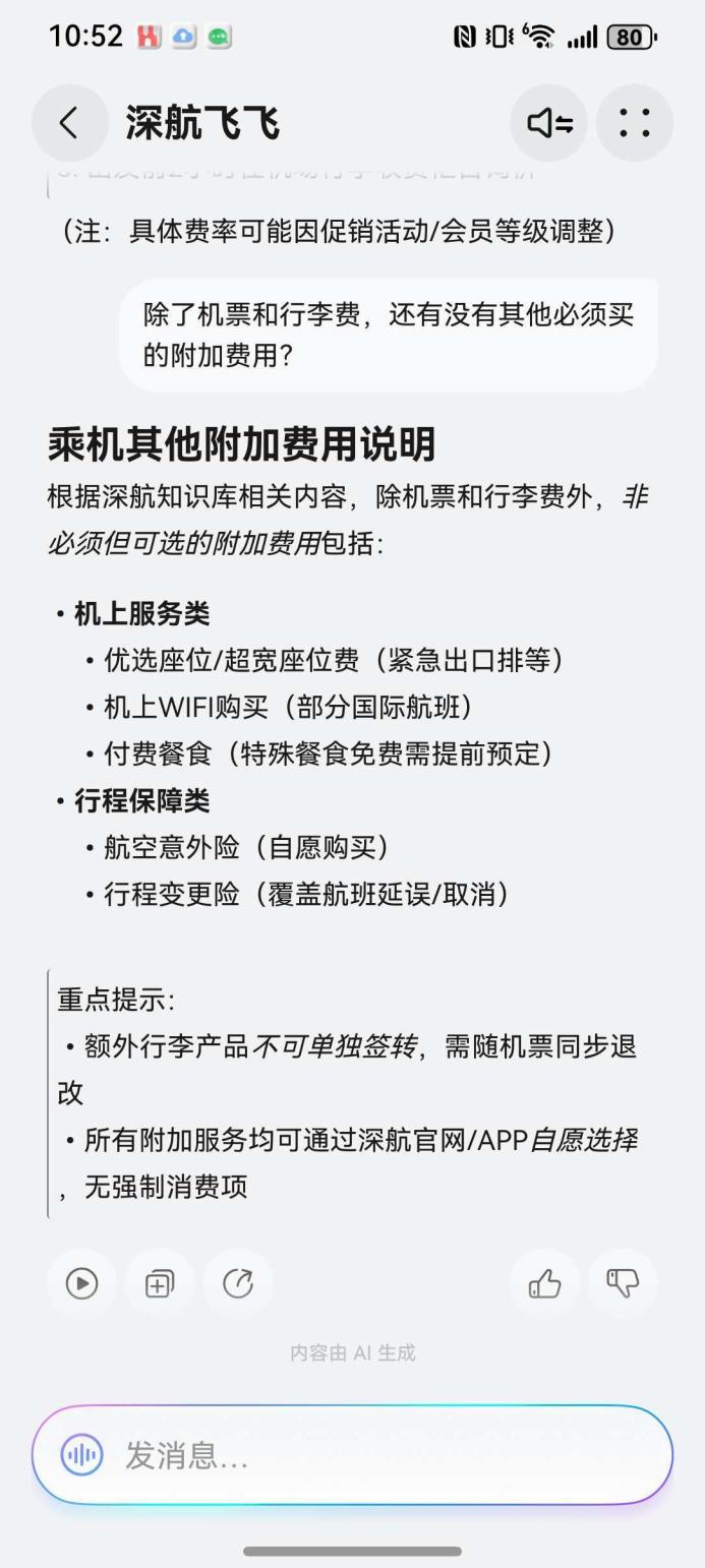 接着我刨根问底:“除了机票和行李费,还有没有其他必须买的附加费用?”深航飞飞Agent的回答让我放心:优选座位、机上WiFi、付费餐食等都属于“机上服务类”自愿选择项,没有任何强制消费。