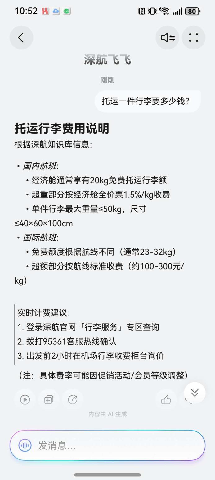 我先从最大的变量入手:“托运一件行李要多少钱?”深航飞飞Agent立刻给出清晰说明:国内航班经济舱通常有20kg免费额度,超重部分按经济舱全价票的1.5%/kg收费,信息一目了然。