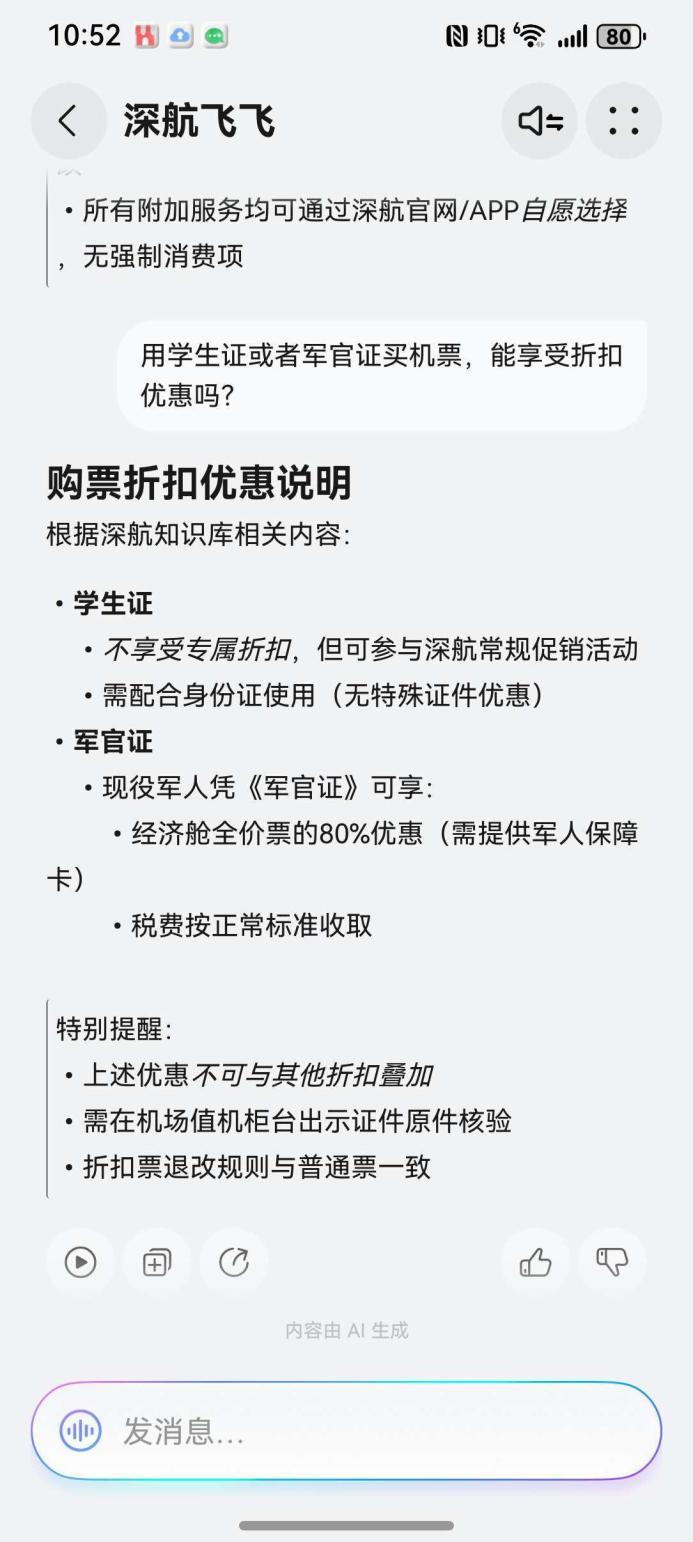 最后,我还不忘发掘省钱之道:“用学生证或者军官证买机票,能享受折扣优惠吗?” 深航飞飞Agent再次给出精准答复:学生证不享受专属折扣,但可参与常规促销;现役军人凭《军官证》可享经济舱全价票的80%优惠。