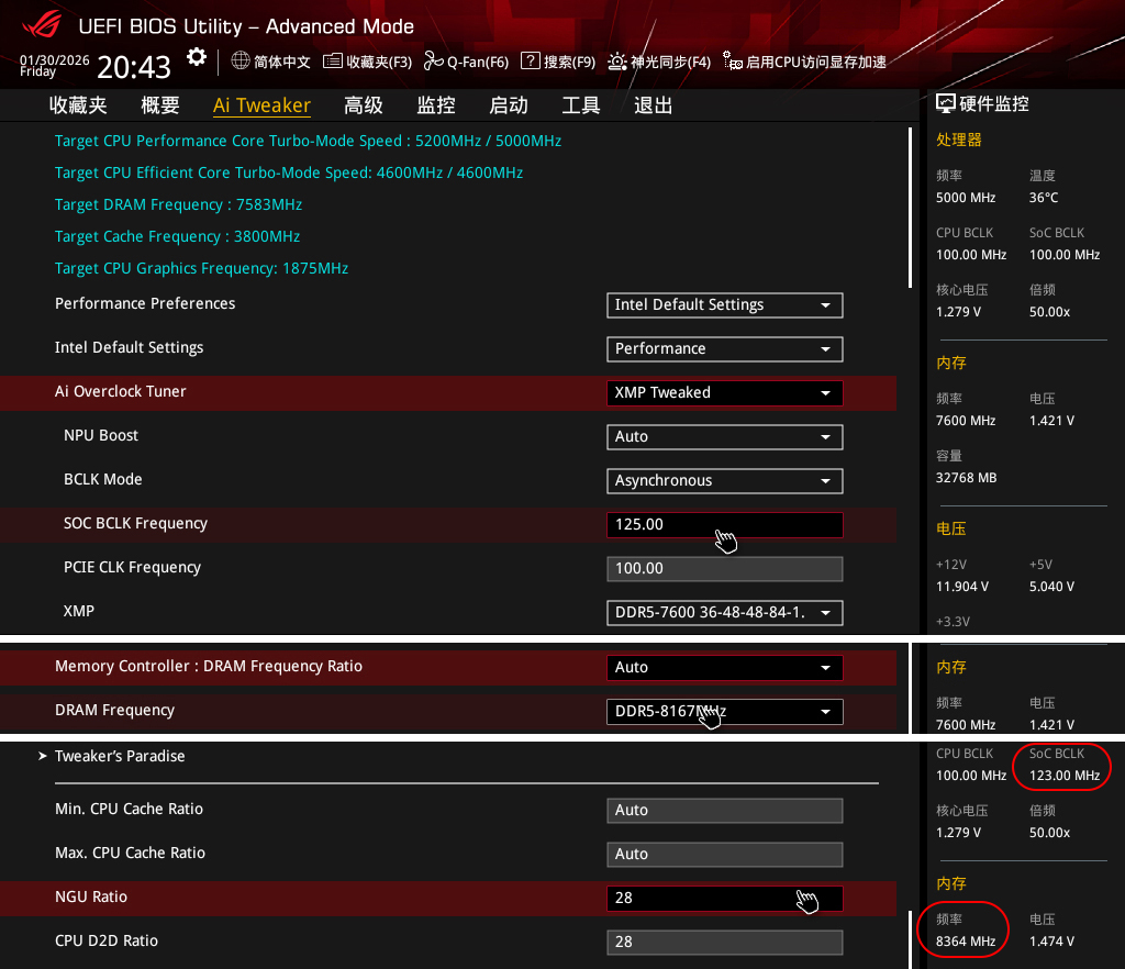 ▼选择XMP Tweaked后,SOC BCLK频率会自动变成125,这时内存频率也会跟着提高。但要注意NGU和D2D的实际频率是现在显示值的1.25倍,如果设置太高会导致死机。最后把SOC BCLK设置成123,内存频率设置为8364,NGU和D2D设置成2.7(实际值为2.8X1.23=3.4)。此外SA电压和防掉压等级也建议提高,以确保稳定性。