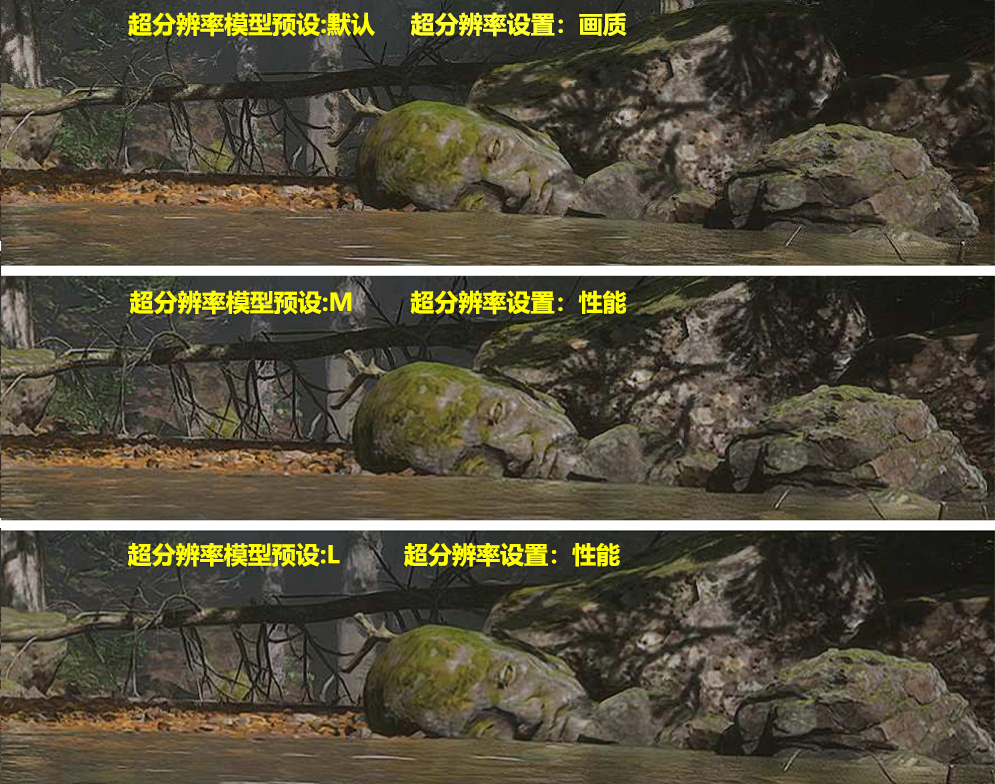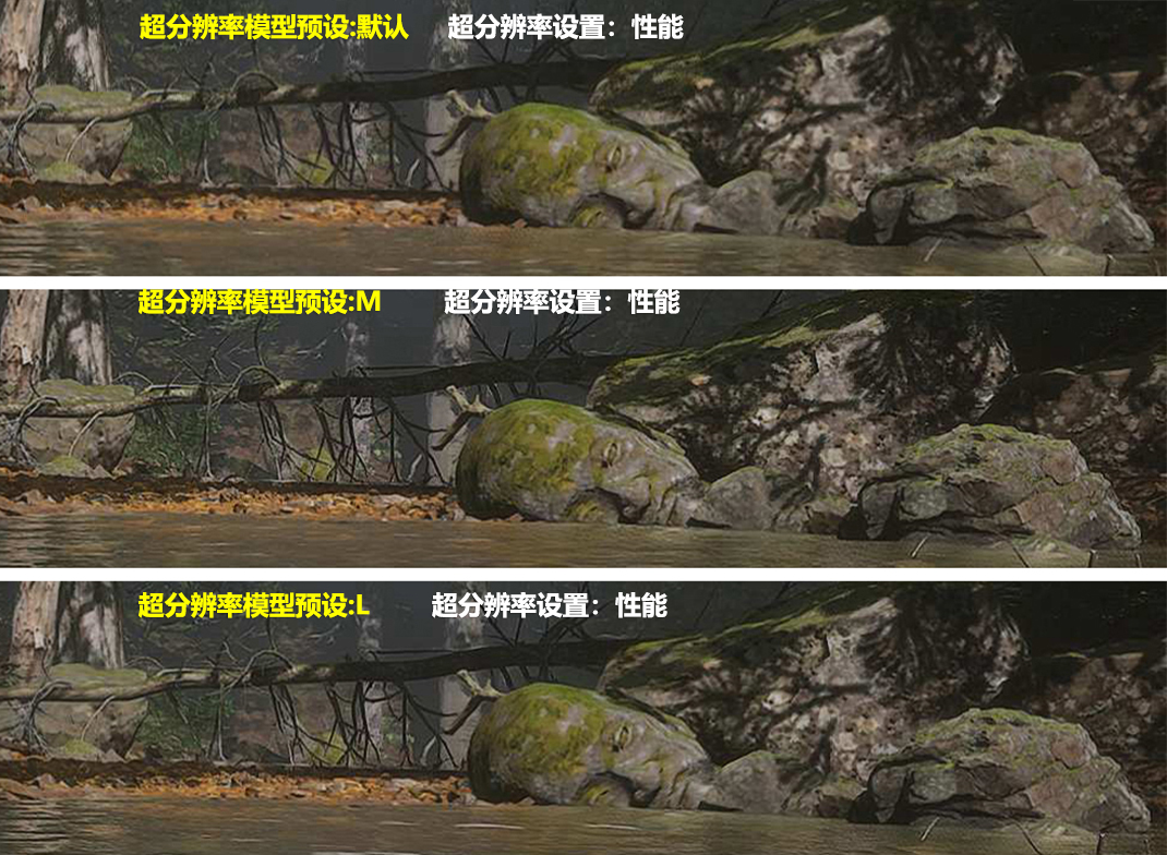 ▼超分辨率设置为性能,对比了默认预设、M预设和L预设的区别。可以看到M和L预设明显要更锐,不过L和M预设的效果要区不算特别大,只在毫厘之间。