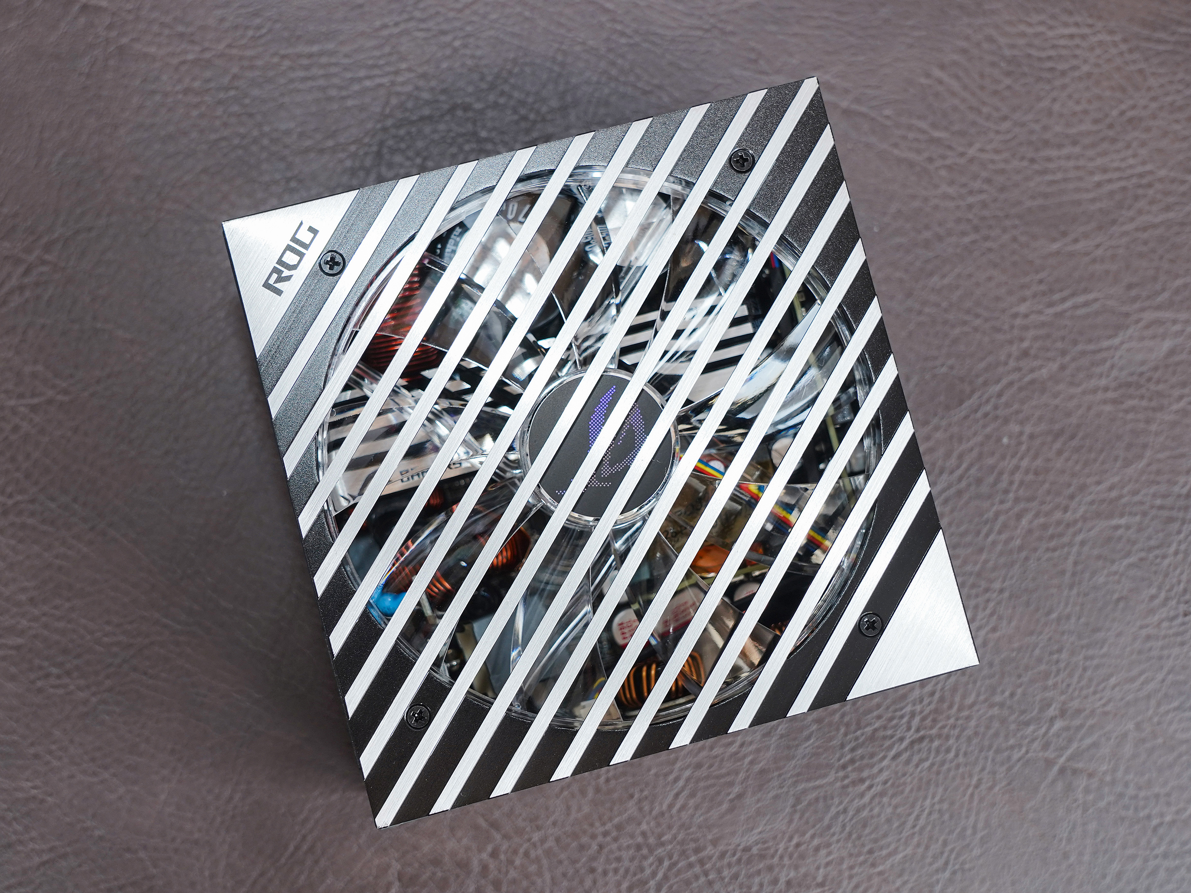 ▼电源尺寸为125x125x63.5mm,ROG LOKI电源内部的用料自然不用担心,外观颜值也是颇高,风扇外面的铝制风扇格栅相当的精致。