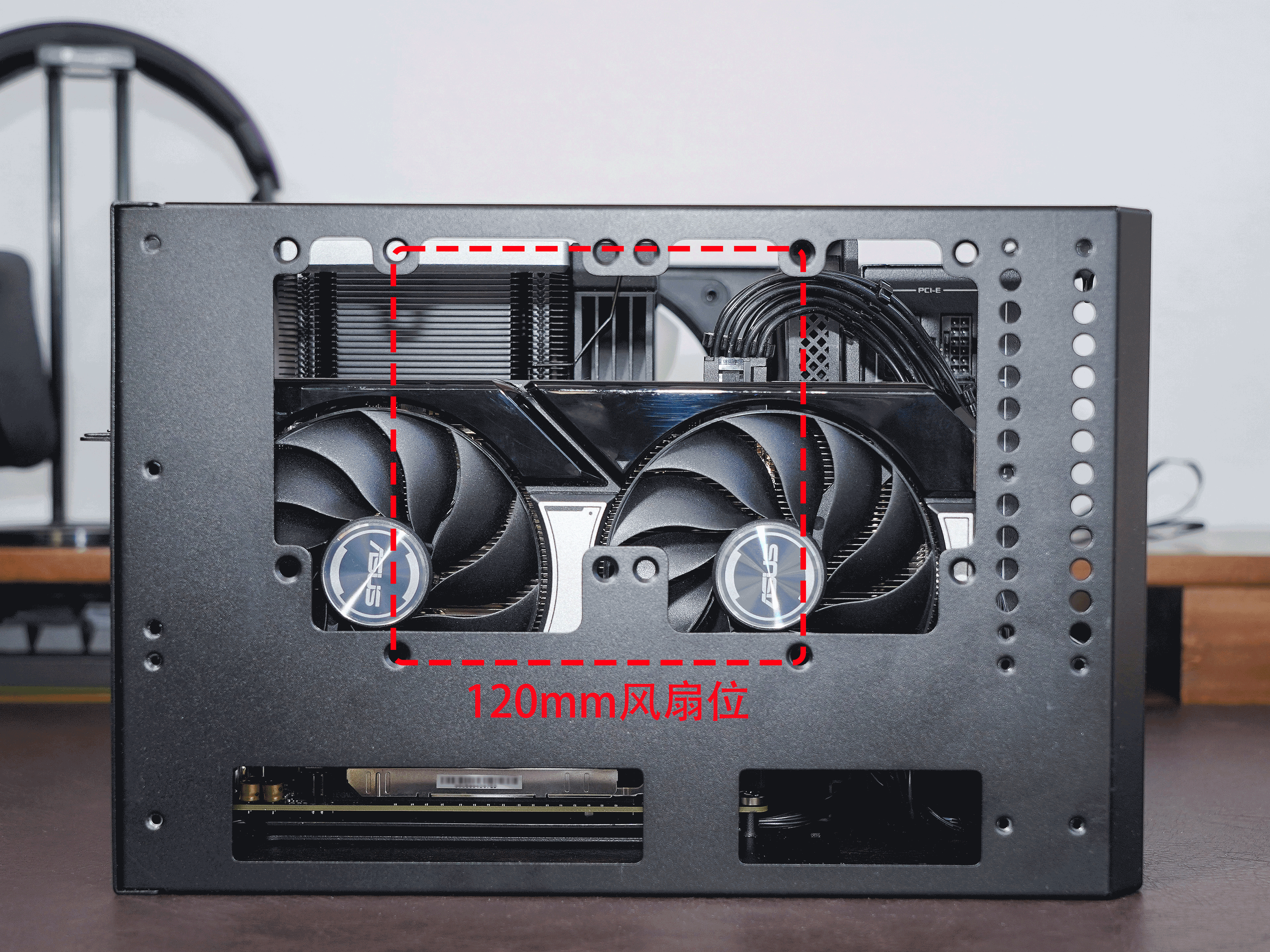 ▼底部支持安装2个90mm风扇,或1个120mm风扇。由于显卡的厚度是2.5槽位的,只能安装15mm厚的超薄风扇,而且风扇和显卡风扇的间距也很小,不仅起不到多少作用,还会增加噪音。