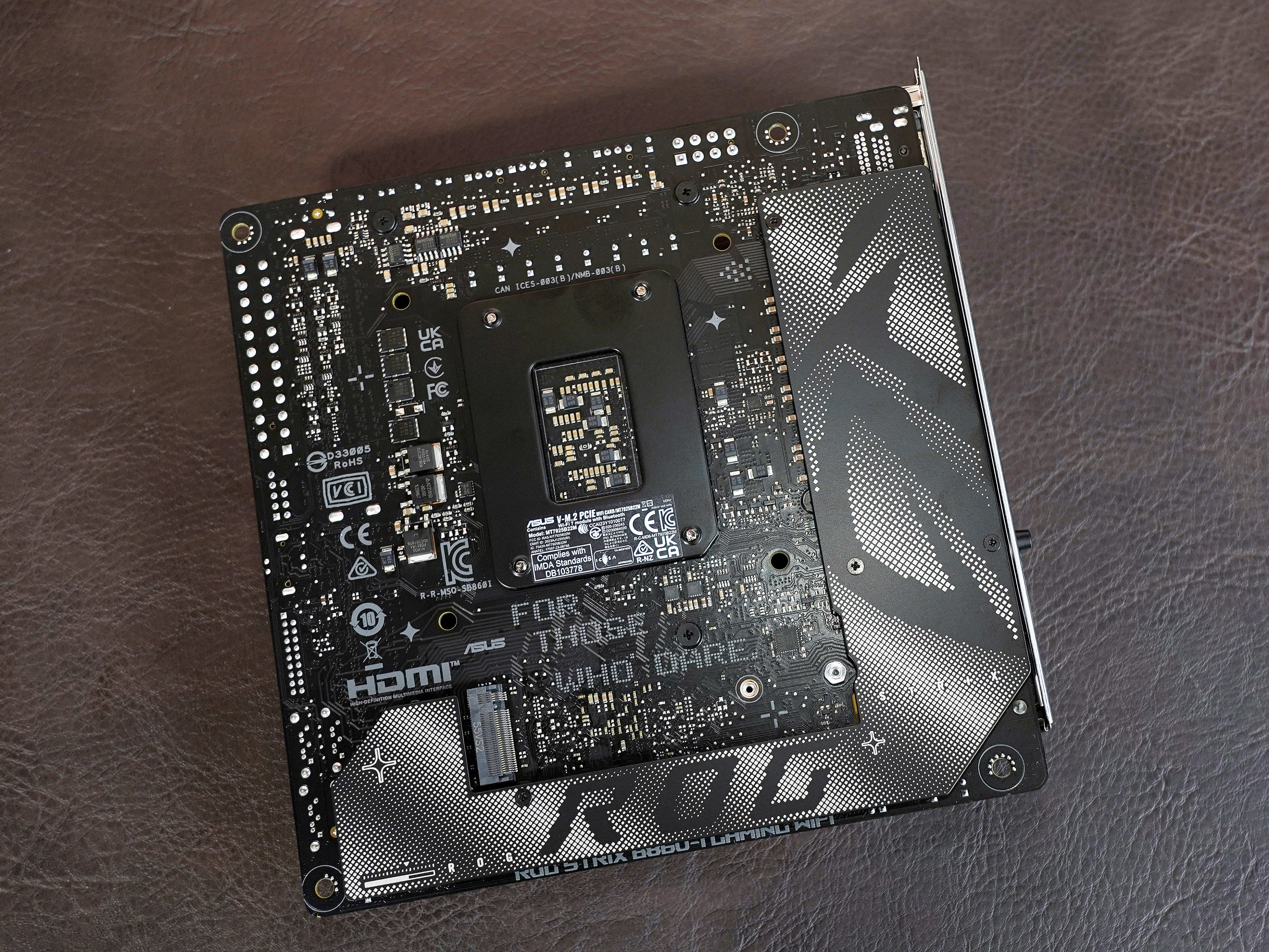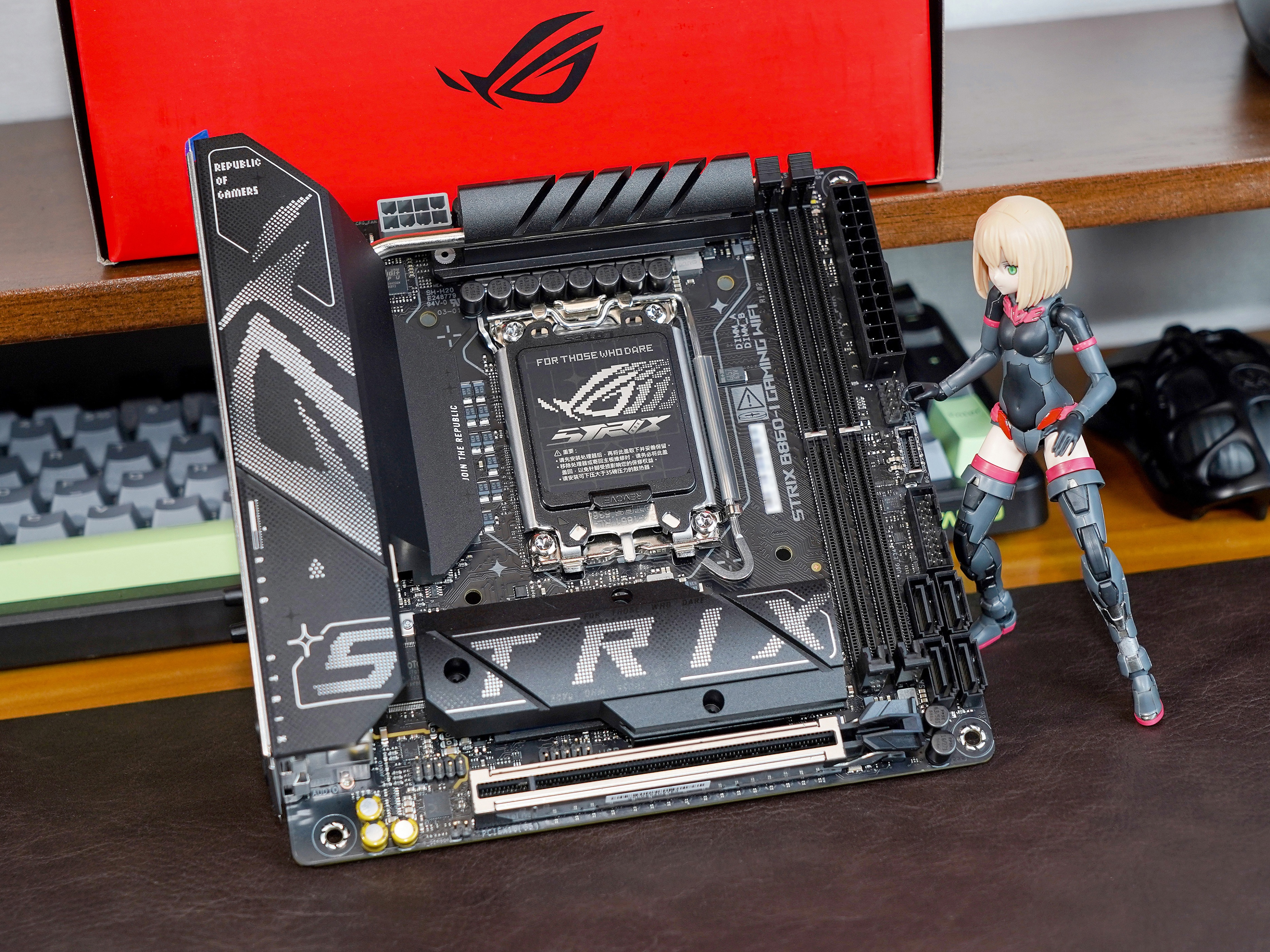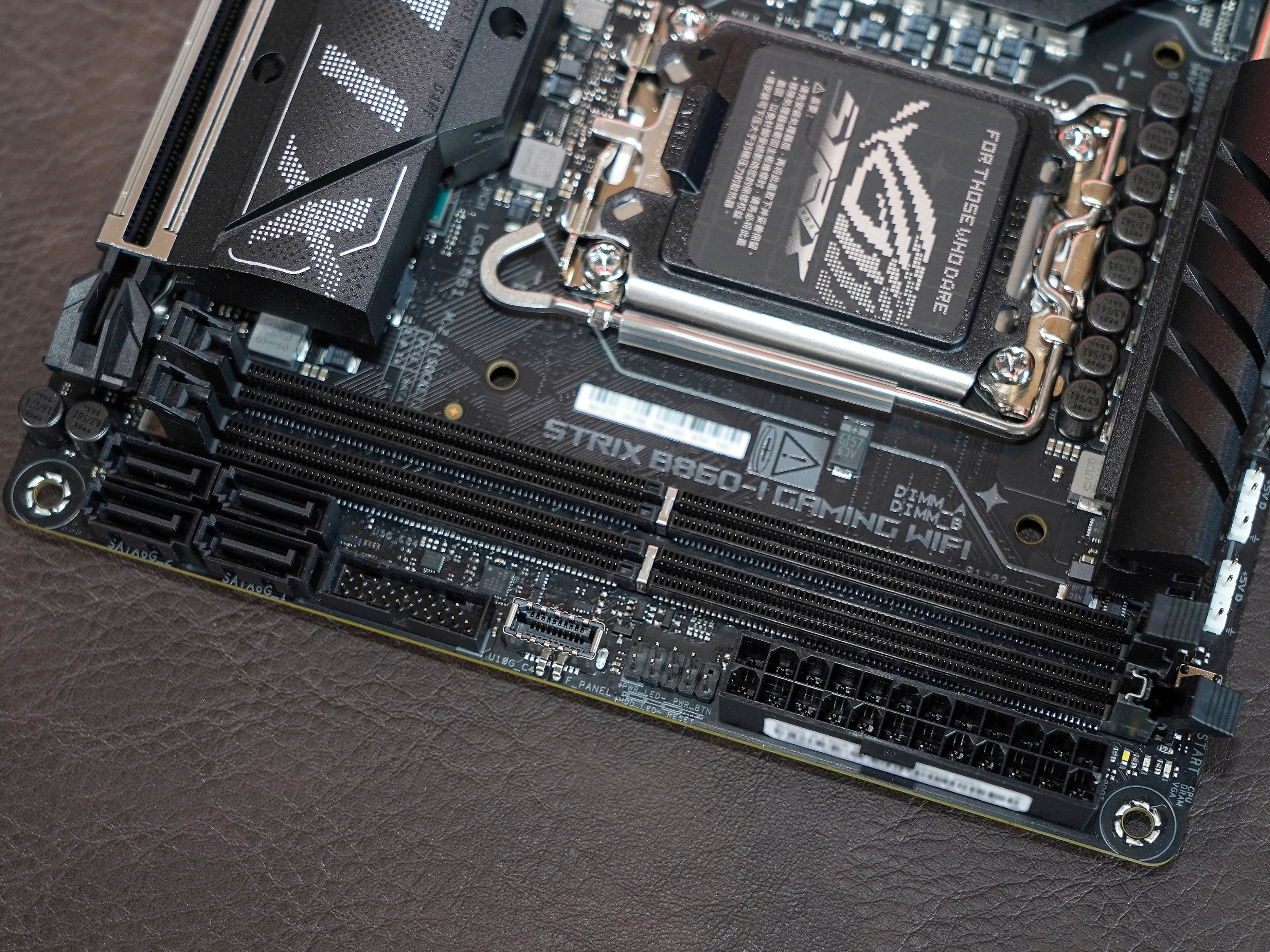 ▼800系列的ITX主板不多,不追求超频,最后选择了ROG STRIX B860-I GAMING WIFI。主板采用了点阵喷绘图案作为装饰,让人眼前一亮。IO装甲上面有败家之眼图形,上面的“S”与M.2散热片形成连接,组成“STRIX”。此外主板采用8层PCB,稳定性也是有所保障。