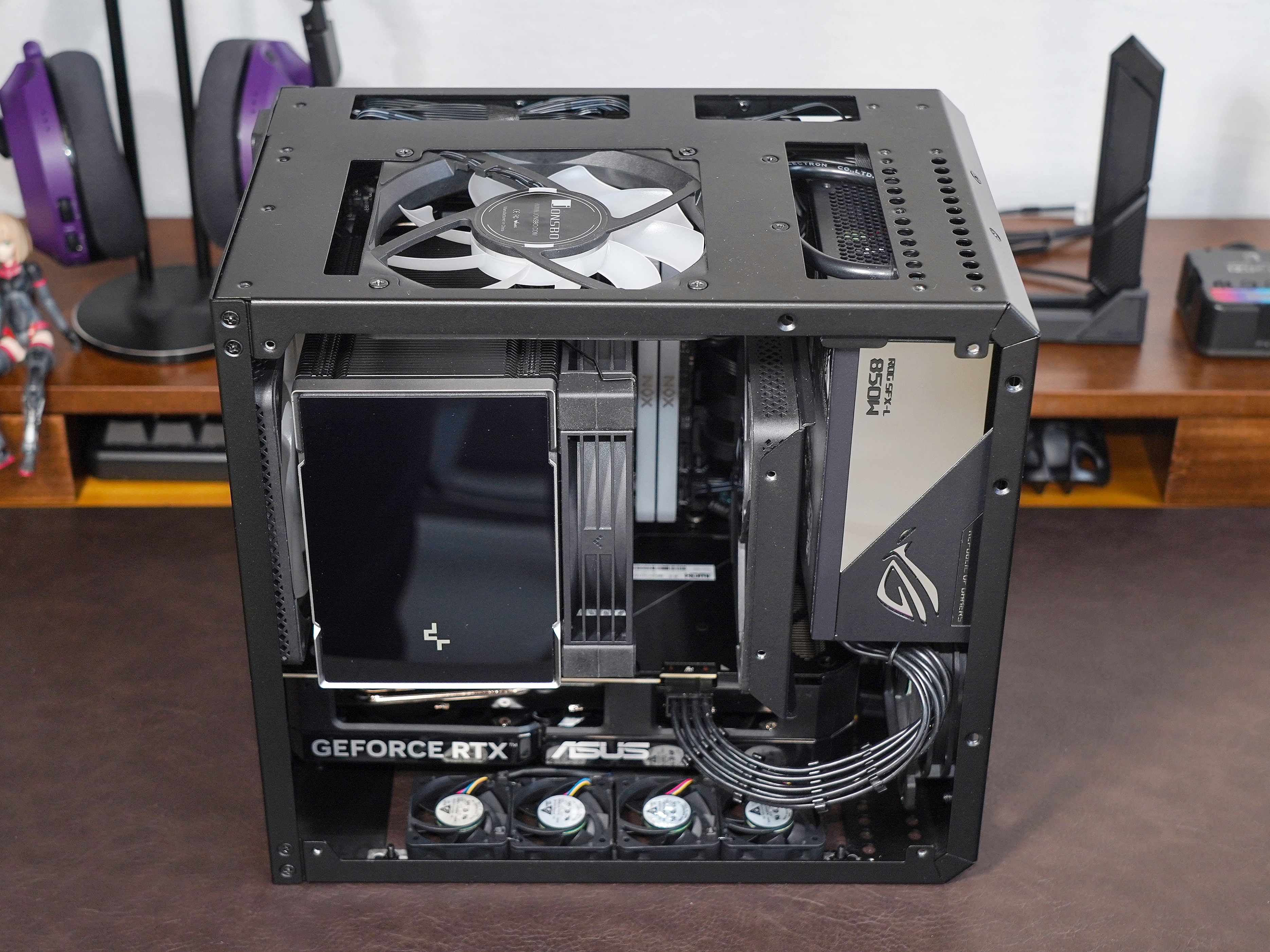 ▼由于AK500 G2的塔体偏向主板IO一侧,机箱后面只能安装15mm的超薄风扇。顶部是可以安装25mm厚风扇,但为了风格统一,安装的也是同款15mm厚的风扇。这样就把C25PLUS的风扇位都装满了,使用了3个120mm风扇、1个90mm风扇、4个40mm风扇,共计8个风扇!