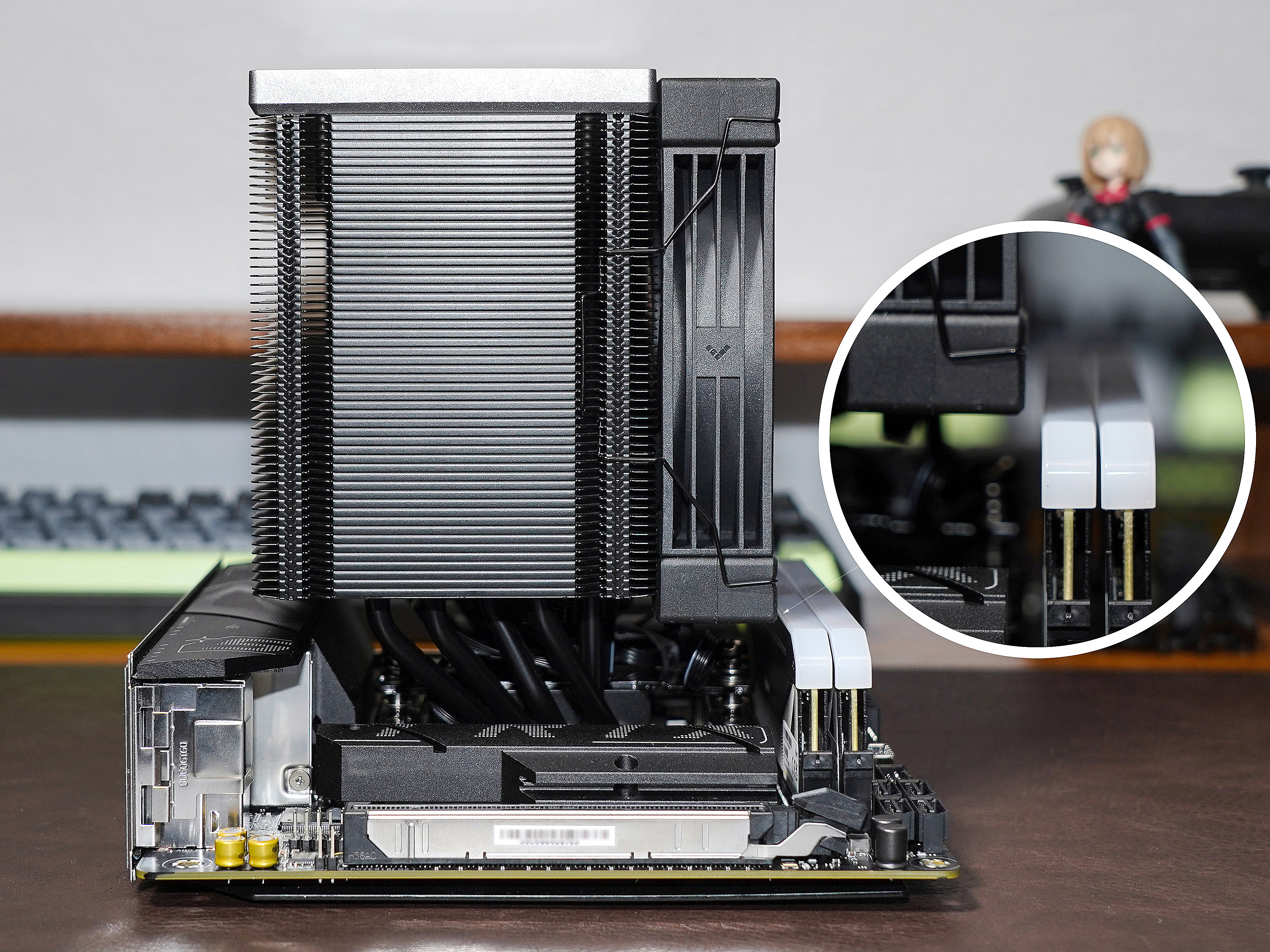 ▼由于散热器是“歪脖子”设计,完全不会和内存产生冲突,也不会挡住内存,甚至两者之间还有一定的缝隙。