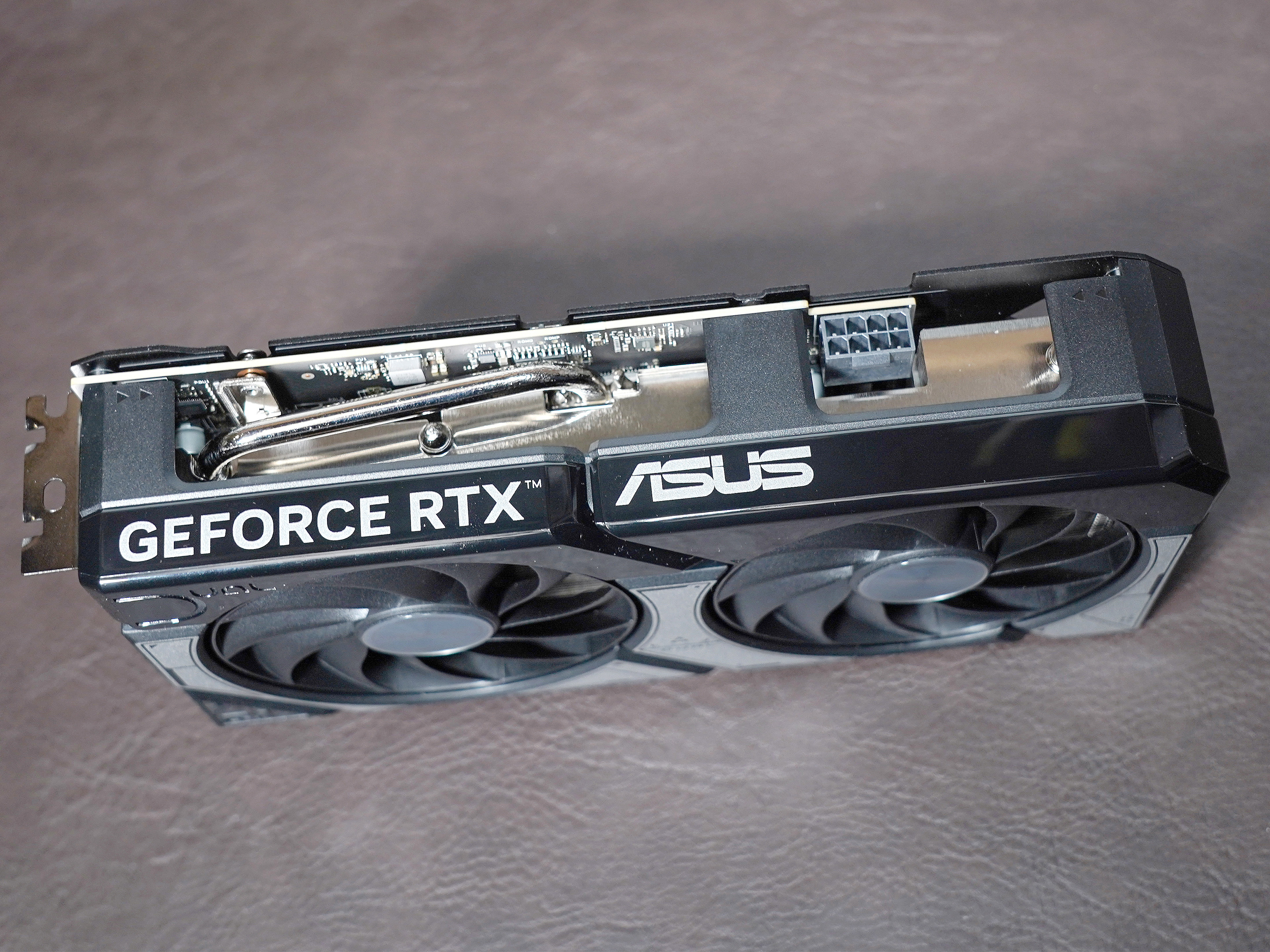 ▼导风罩侧面采用了开放设计,外侧印有GEFORCE RTX和ASUS,显卡采用单8pin外接供电设计,但要注意接口是正向设计的(即卡扣朝向下)。显卡虽然不长,但厚度达到了2.5槽位,ITX系统还是要注意下兼容性问题。