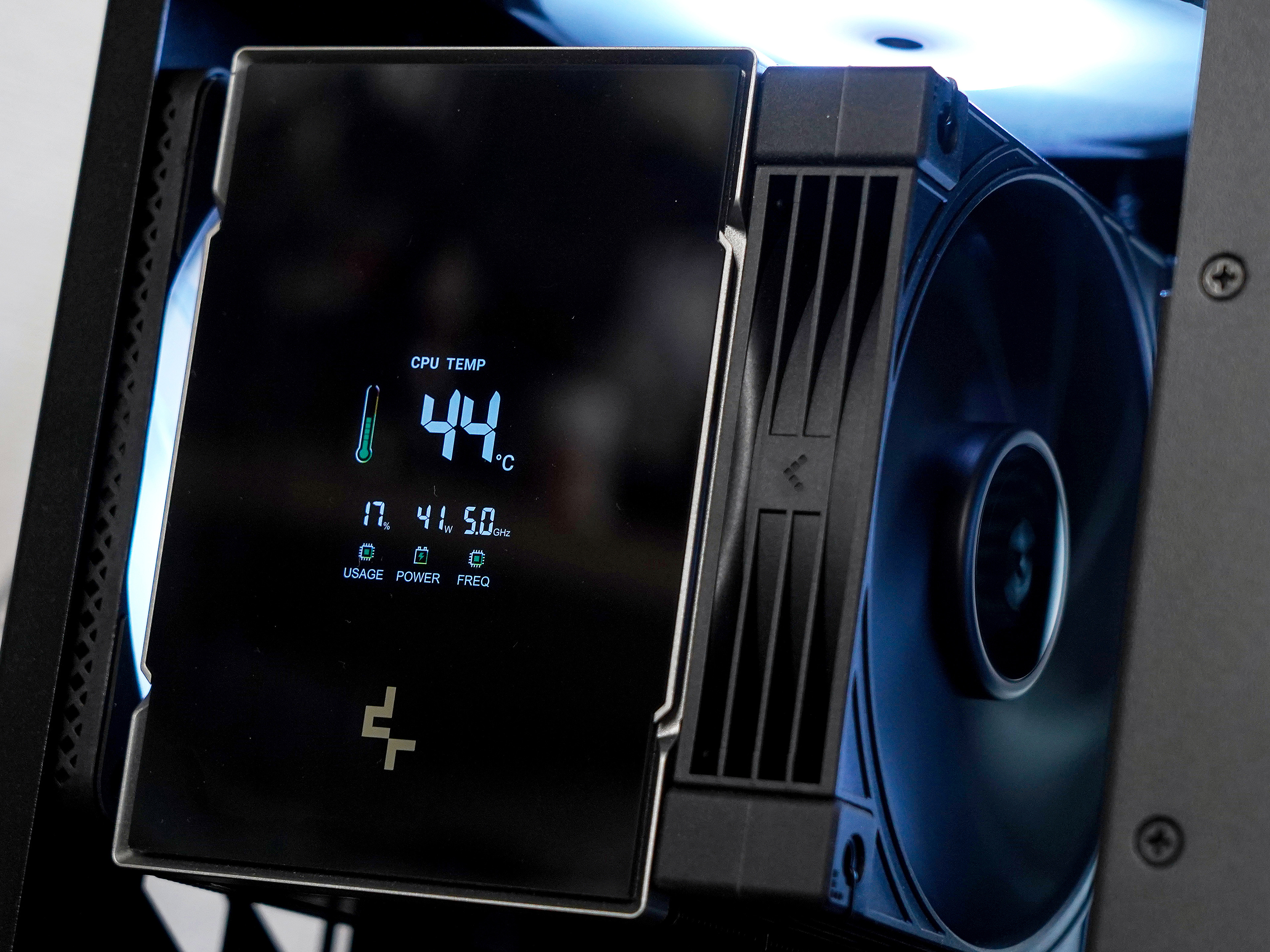 散热器顶盖有显示屏,可以实时显示CPU的状态。相比水冷头的屏幕,距离机箱侧透玻璃板更近,看着也更加方便些,美中不足的是这个屏幕稍微小了点。