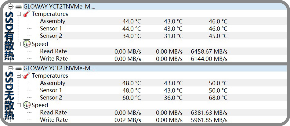 ▼下面来对比下有无这块机箱侧板散热的差别。测试方法为运行CrystalDiskMark一次,记录最高温度。测试的SSD,速度为PCle 4.0 X4,无缓存,即使没有散热辅助,闪存温度也只是增加了4℃,但主控温度则增加了13℃!改造还是比较成功的!