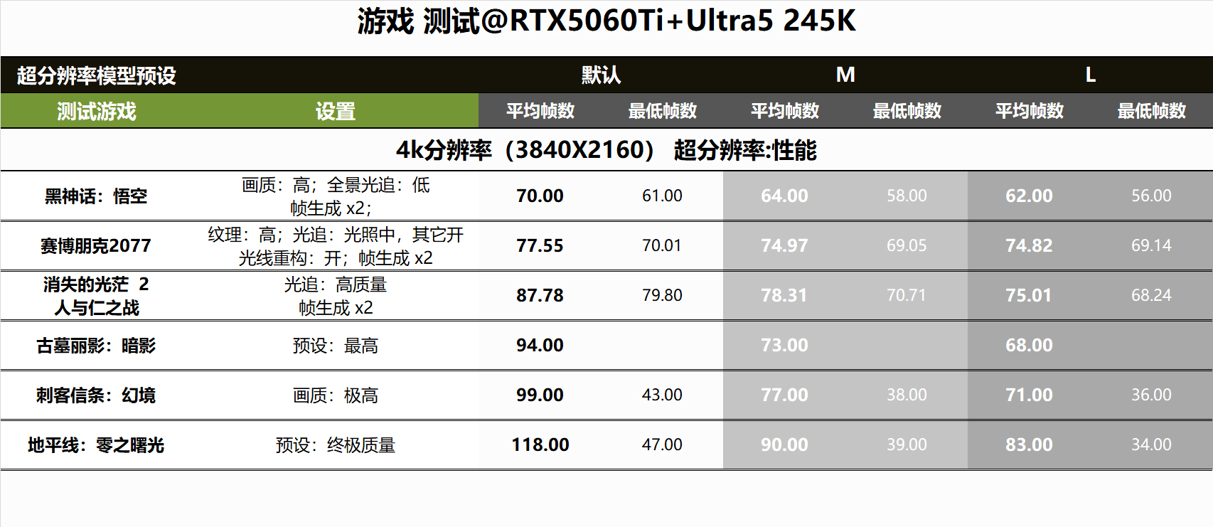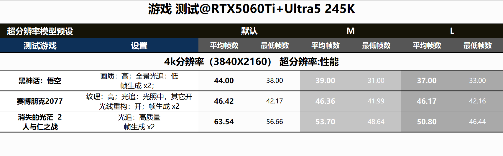 ▼新预设中设置成性能的效果与默认预设中设置成画质区别不大,如果新预设的性能帧数高于默认预设的画质帧数,那么DLSS4.5的实用价值就很高了。《黑神话:悟空》和《消失的光芒2》都是新预设的帧数更高,让5060ti在4K分辨率达到60fps以上。《古墓丽影》的差距不大,另2款游戏则是相反的趋势。