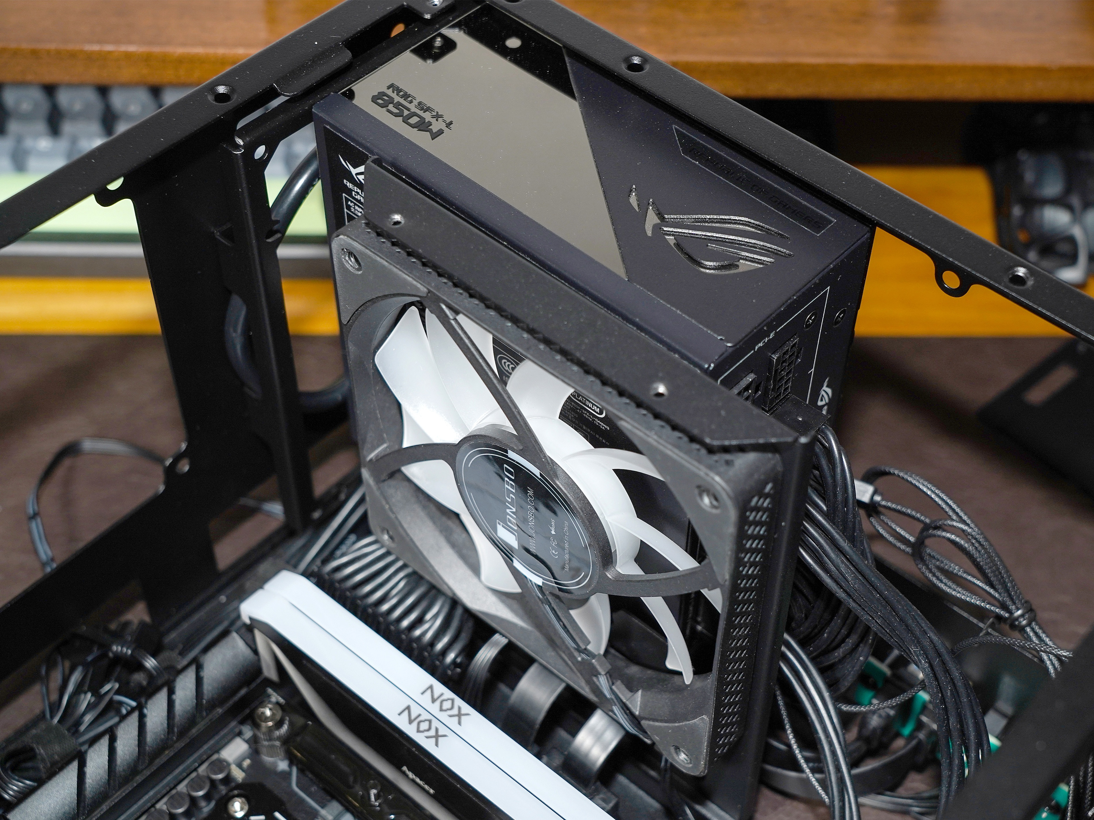机箱支持ATX电源和SFX电源,上ATX电源会有所限制,SFX又担心其风扇太小噪音太高,最后选择SFX-L电源:ROG-LOKI-850P-SFX-L-GAMING,其实我本想入手的是750w的型号,但因为缺货最终选择了850w,冗余有点大了。
