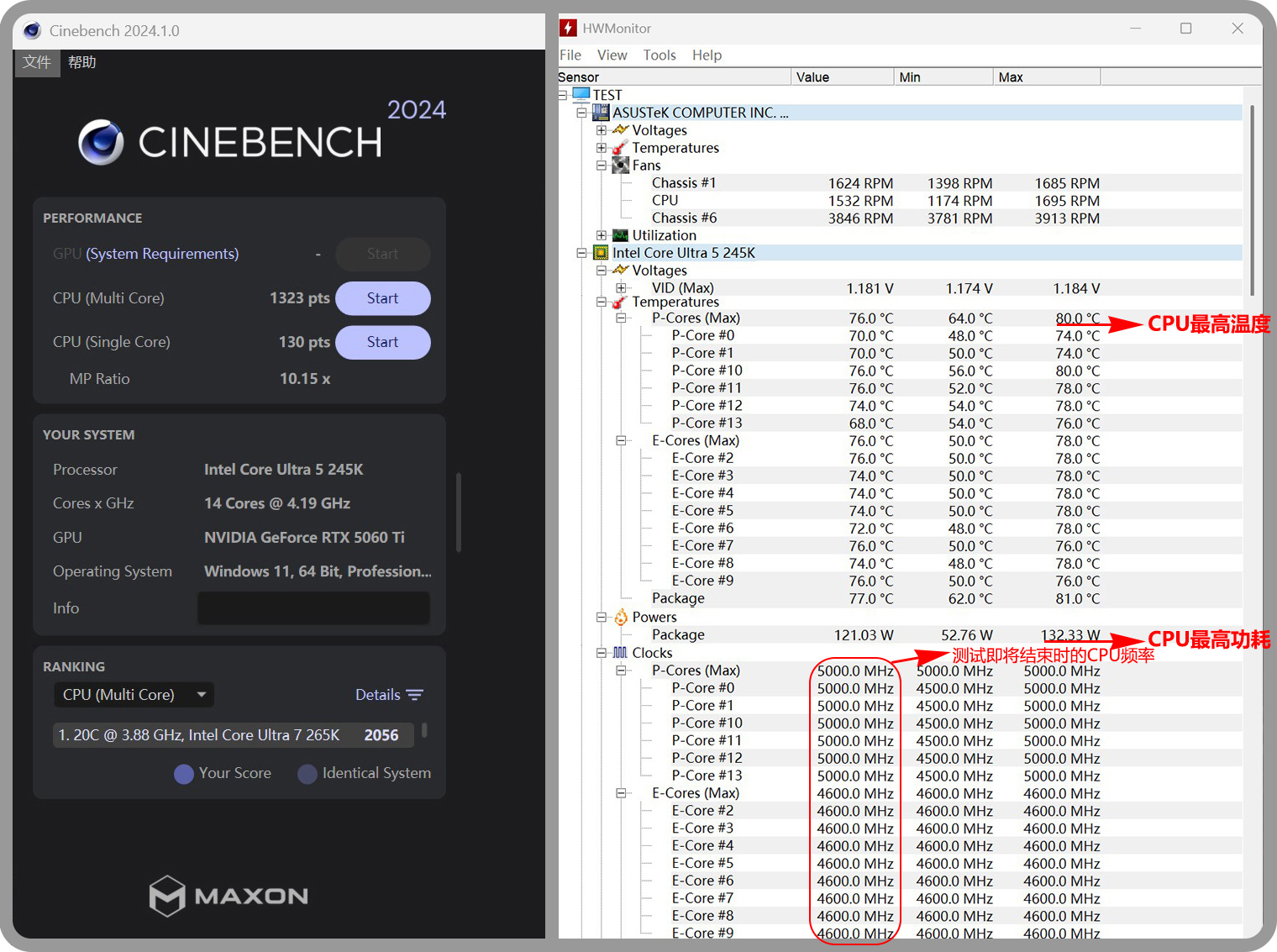 ▼试下CPU负载较重的渲染测试CineBench R24(测试时间10分钟)。使用CPUID HWMonitor监看CPU并没有降频,P核最高温度80°C,E核最高温度78°C,最大功耗为132w,运行状态良好。