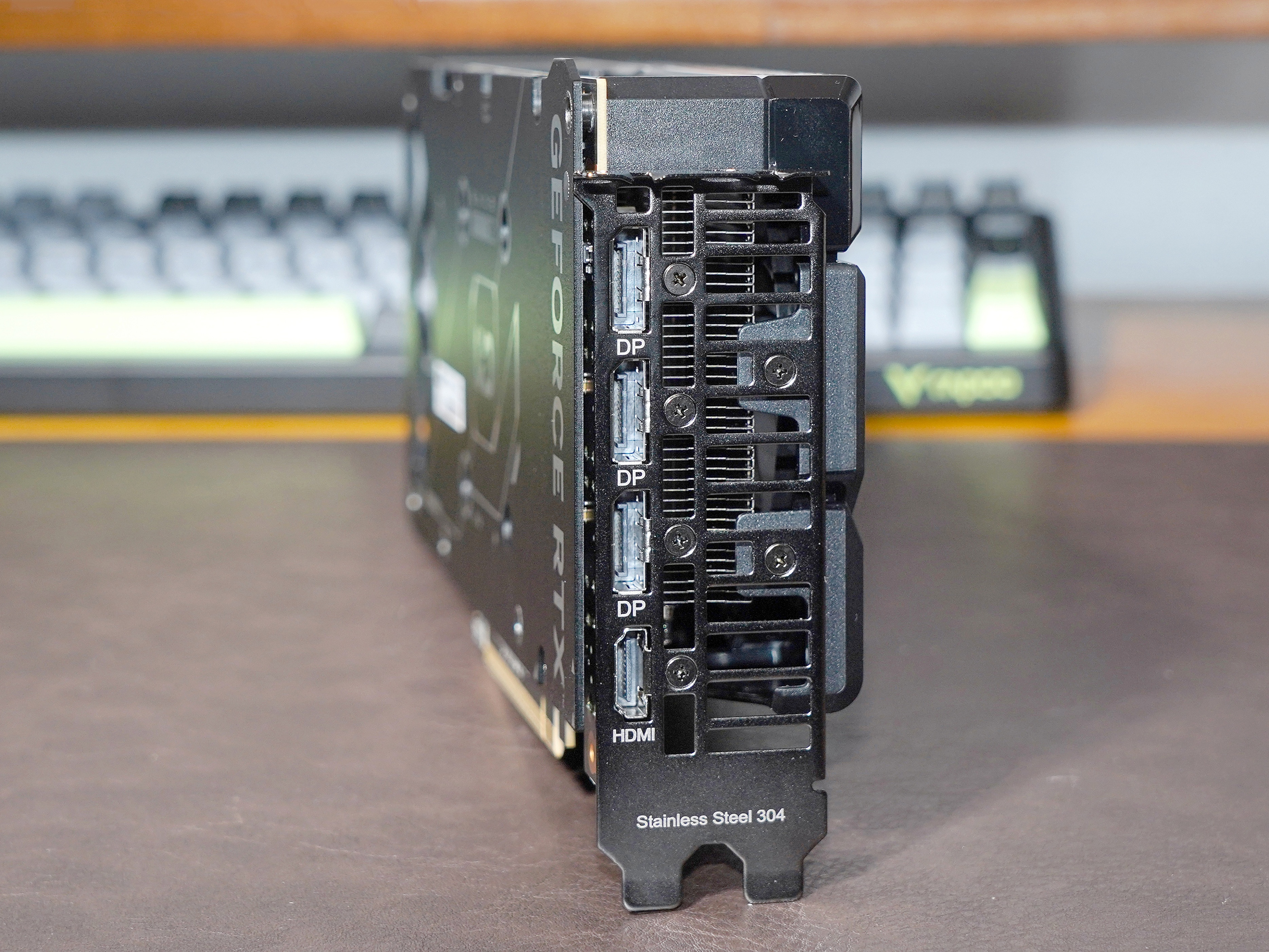 ▼IO挡板为不锈钢材质,接口方面采用了NVIDIA标准的3DP+1HDMI组合,显卡是微越肩设计的,要宽过档板一些。