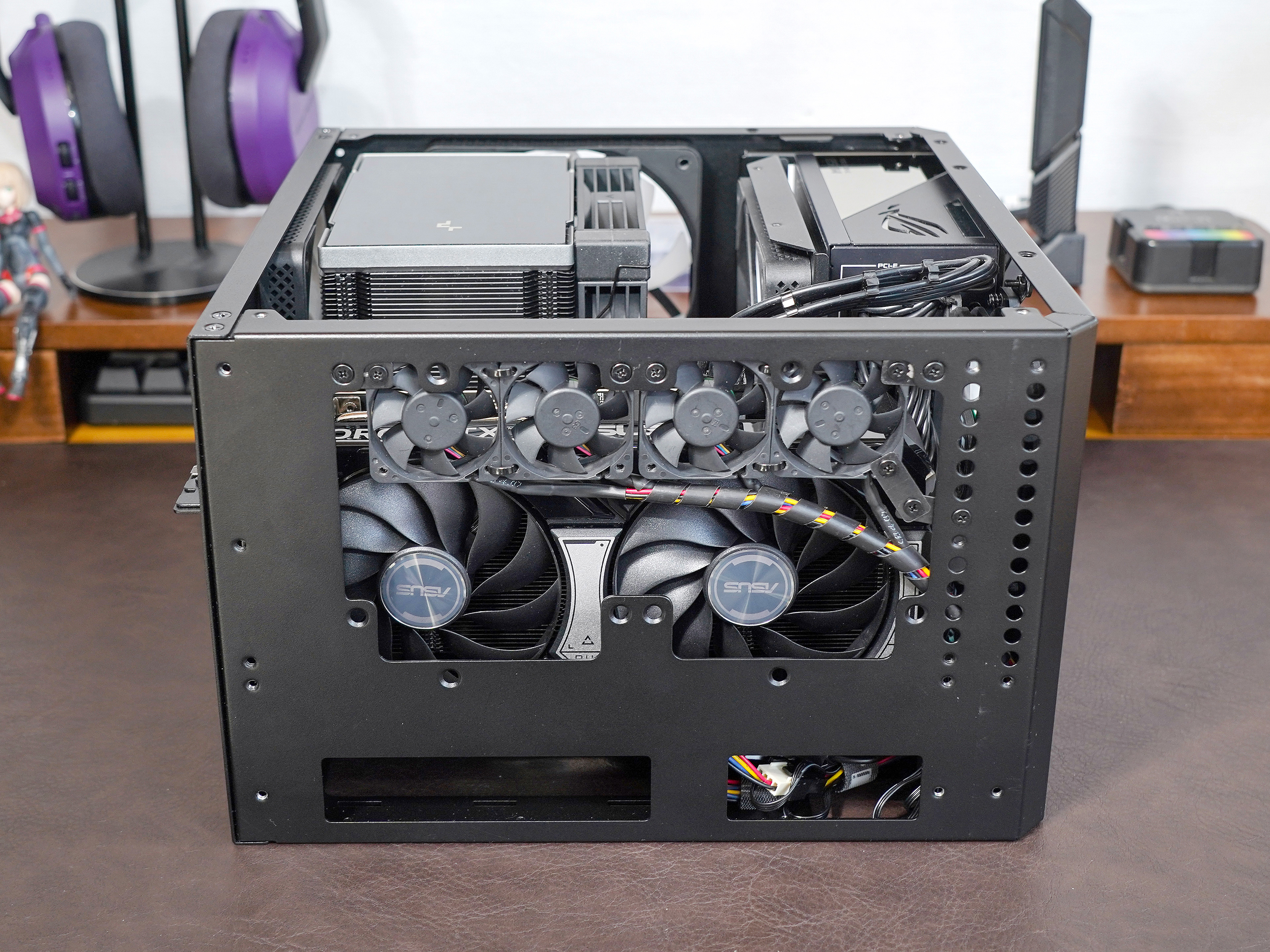 ▼为了不干扰显卡风扇进风,同时有底部风扇来加强主机的进气,最后选择4个40mm的风扇连成一排。