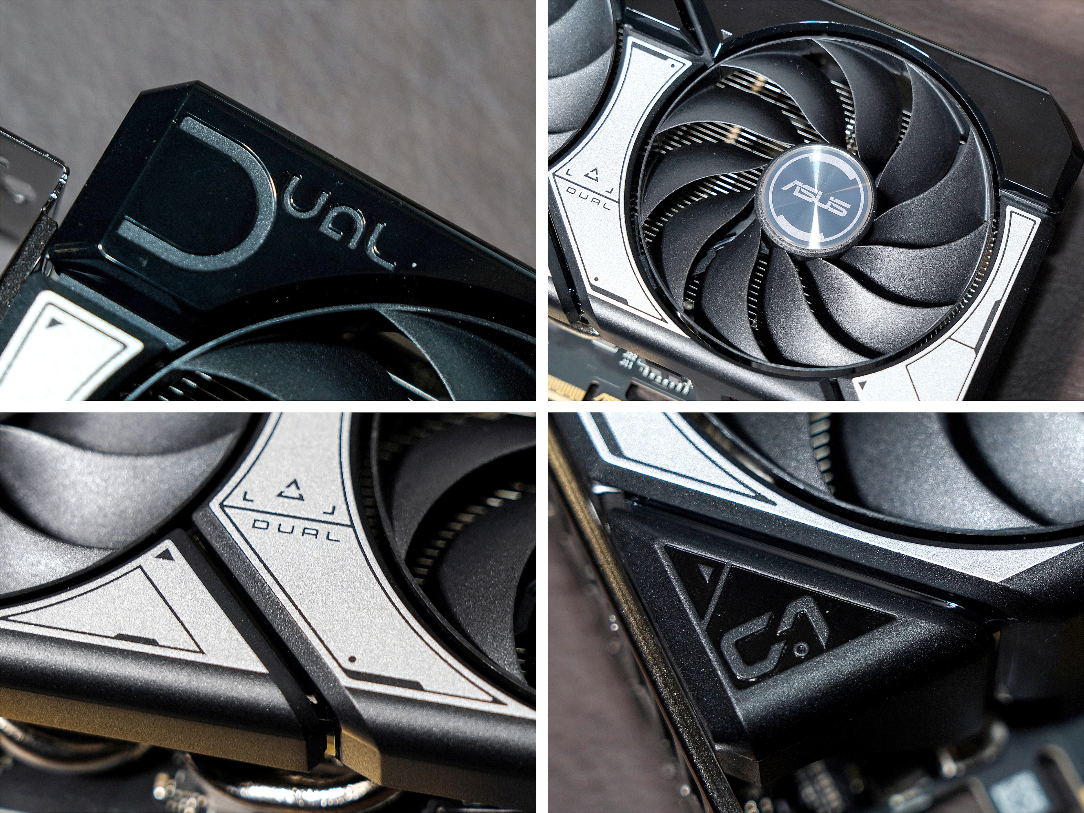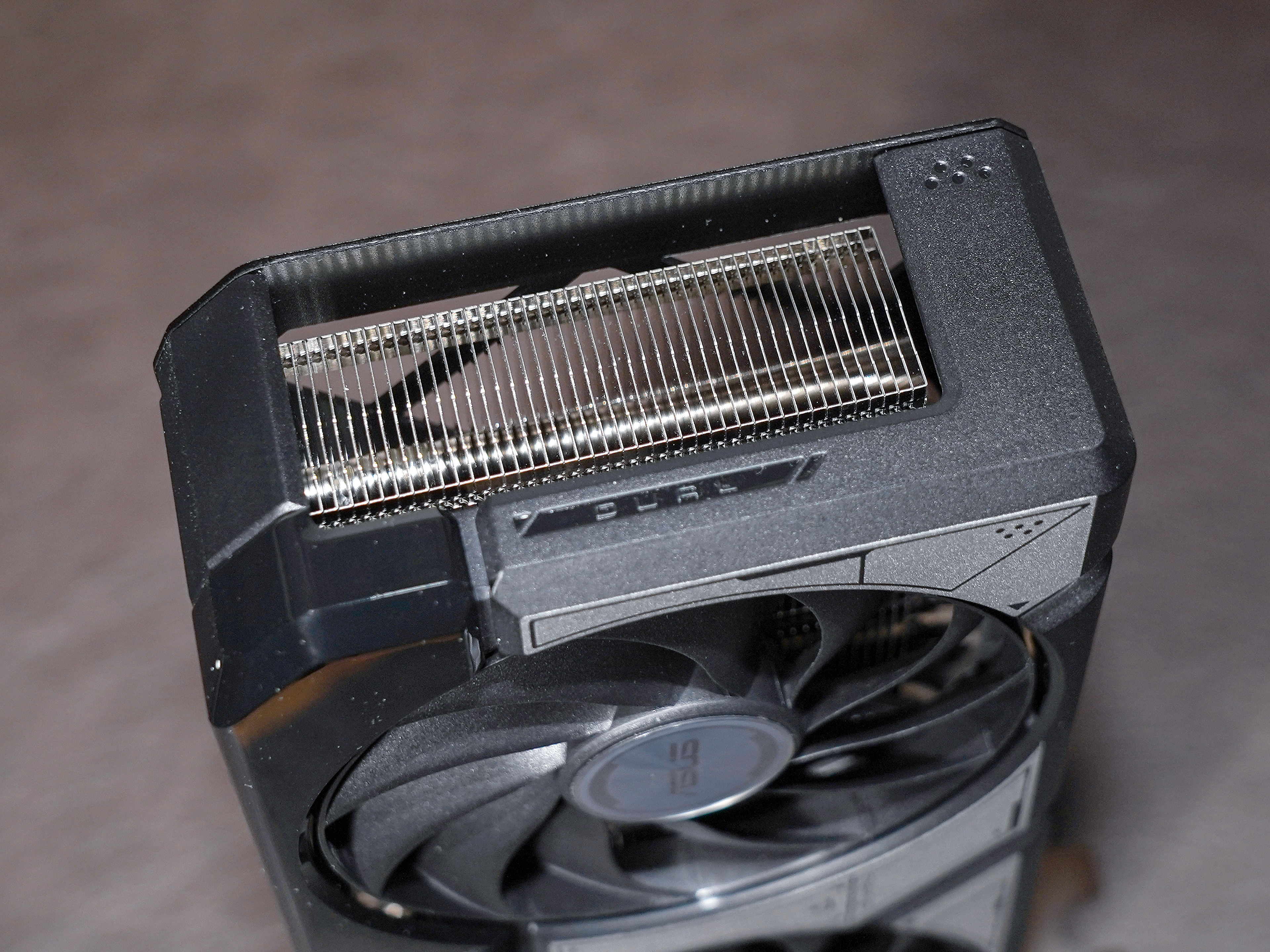 ▼风扇扇叶采用变曲面设计,93mm11片扇叶,配合环形密封圈进一步增强风扇的整体稳定性和强度;风扇罩虽然是塑料材质的,但设计了很多机甲风格的元素,再加上涂装,变得很有金属感。此外还将DUAL LOGO巧妙融入其中,让显卡显得很硬核。