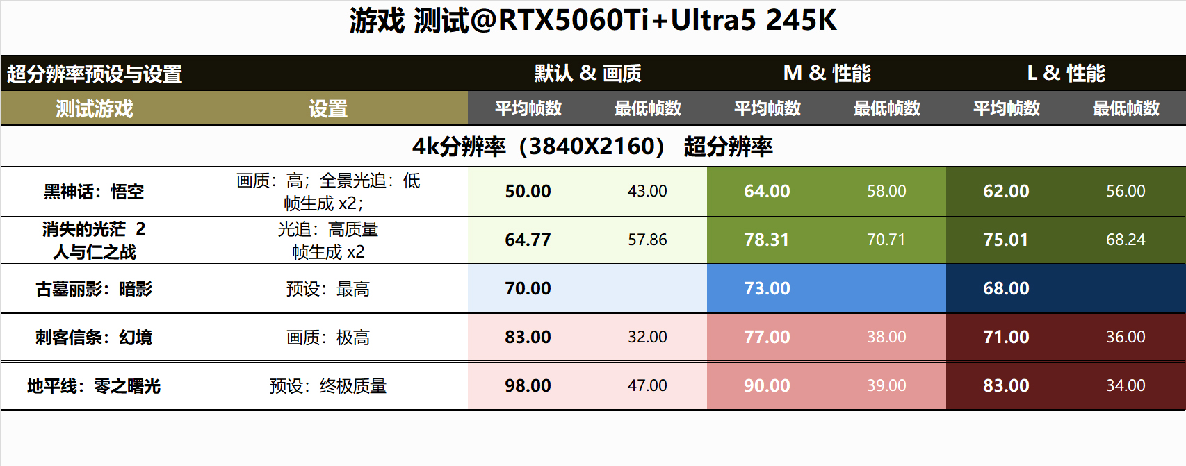 RTX 5060 Ti (16G)只要适当的降低一些画质也是可以玩到4k分辨率&60fps的。而且DLSS 4.5对于部分游戏也是有助力的!只是16G版本的现在溢价有点高,游戏玩家选择5070会更好。