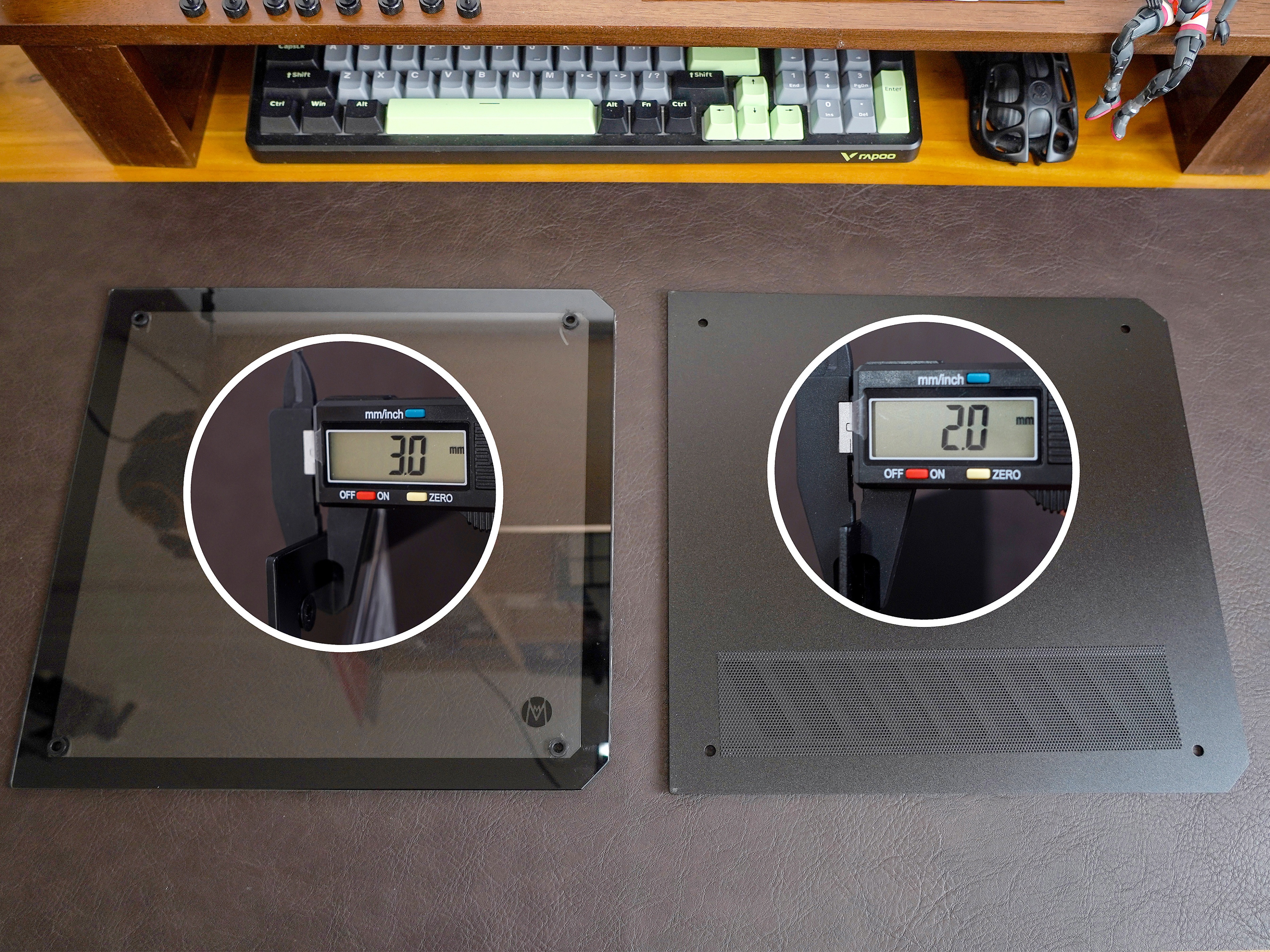 ▼左部为玻璃侧板,厚度3mm,右部为钢板,厚度2mm,对应显卡部分有散热格栅+防尘网的设计,加强显卡部分的散热。