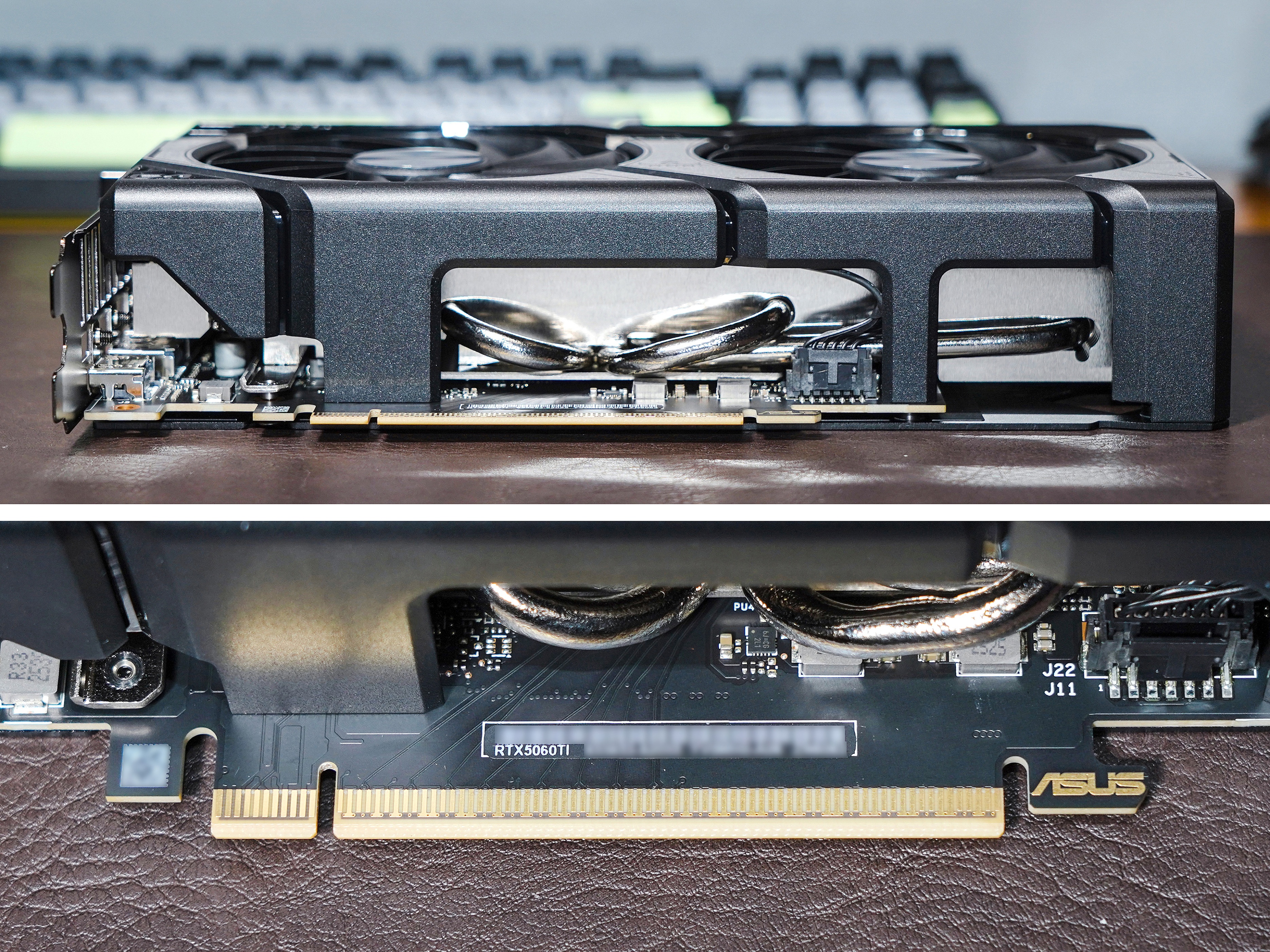 ▼显卡配备了三条6mm镀镍热管,在鳍片中2根成U型,一根成S型弯折和交错后延展至散热片各处,覆盖的面积还是比较大的。 5060Ti 的位宽虽然只有X8,但金手指依然布满,上面还有华硕独有的金色品牌LOGO。