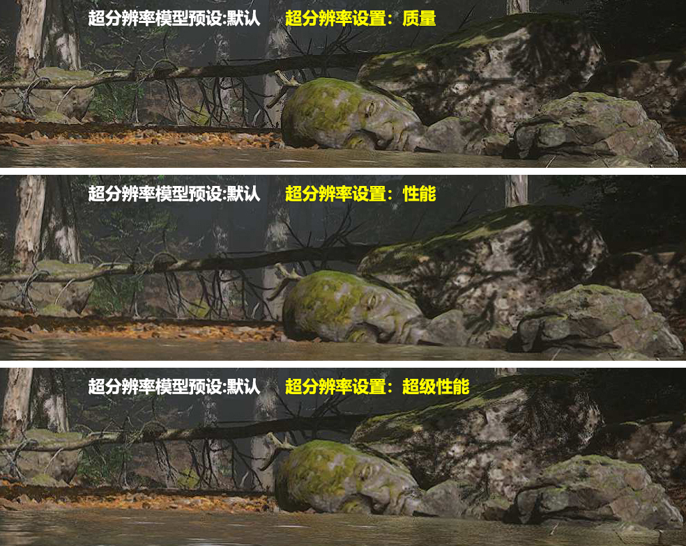 ▼默认预设下超分辨率设置从画质降低到性能,某些游戏有时候会出现明显的bug,比如下图中树木的影子完全花了。而M预设下的性能已经修正了bug,提升了体验。