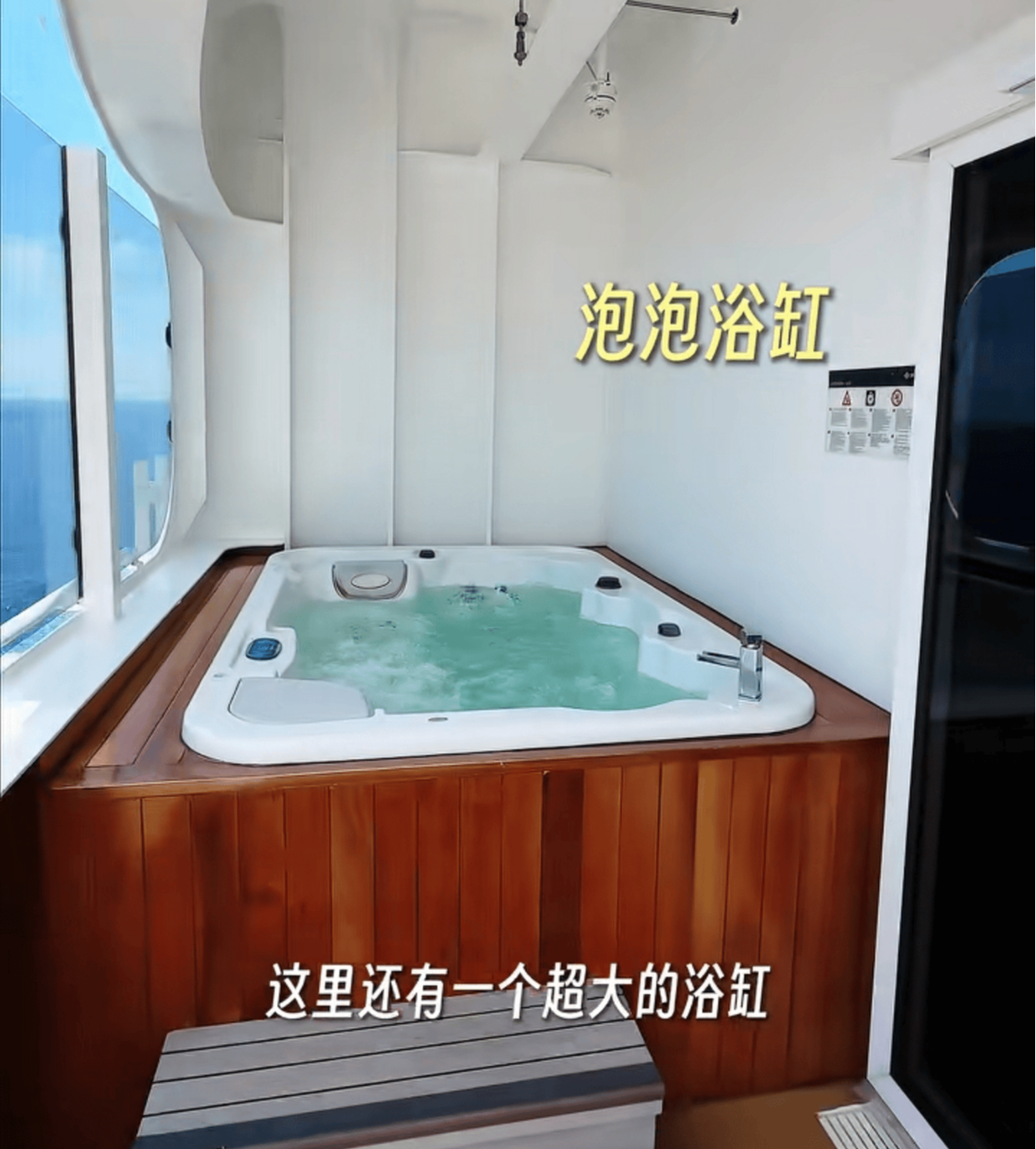 住的是堪比五星级酒店的豪华海景套房,各种设施一应俱全,连浴缸都带按摩功能,还有大露台,真是享受。