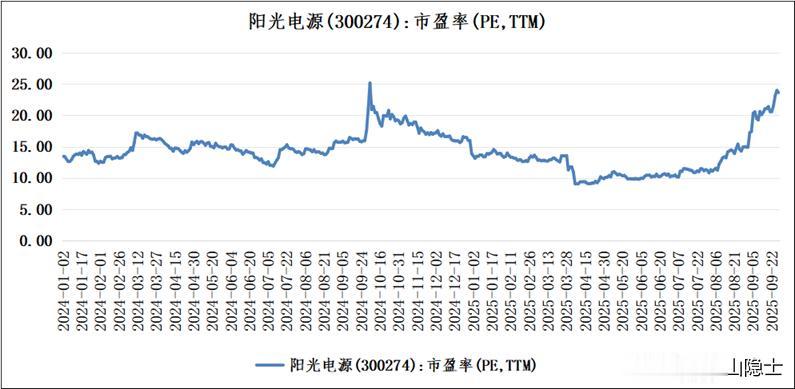 在A股有一家和横店东磁类似的光伏企业,它就是阳光电源,2025年4月,阳光电源的市盈率(TTM)跌至10倍左右。2025年上半年,阳光电源的收入增速和利润增速分别为40%和56%。后来,中美关系缓和,阳光电源的股价上涨,市盈率(TTM)迅速拉升9月26日的23.6倍,接近2024年10月的高点。