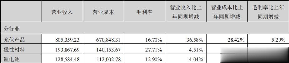 光伏产品、磁性材料、锂电池的收入占比分别为67.47%、16.24%和10.77%,三者合计为94.48%。剩下的5.52%的收入来自于器件(3.62%)和其他(1.9%)。在归类上,横店东磁把器件和磁性材料绑定,认为同属于一类业务,即“磁材+器件”业务。
