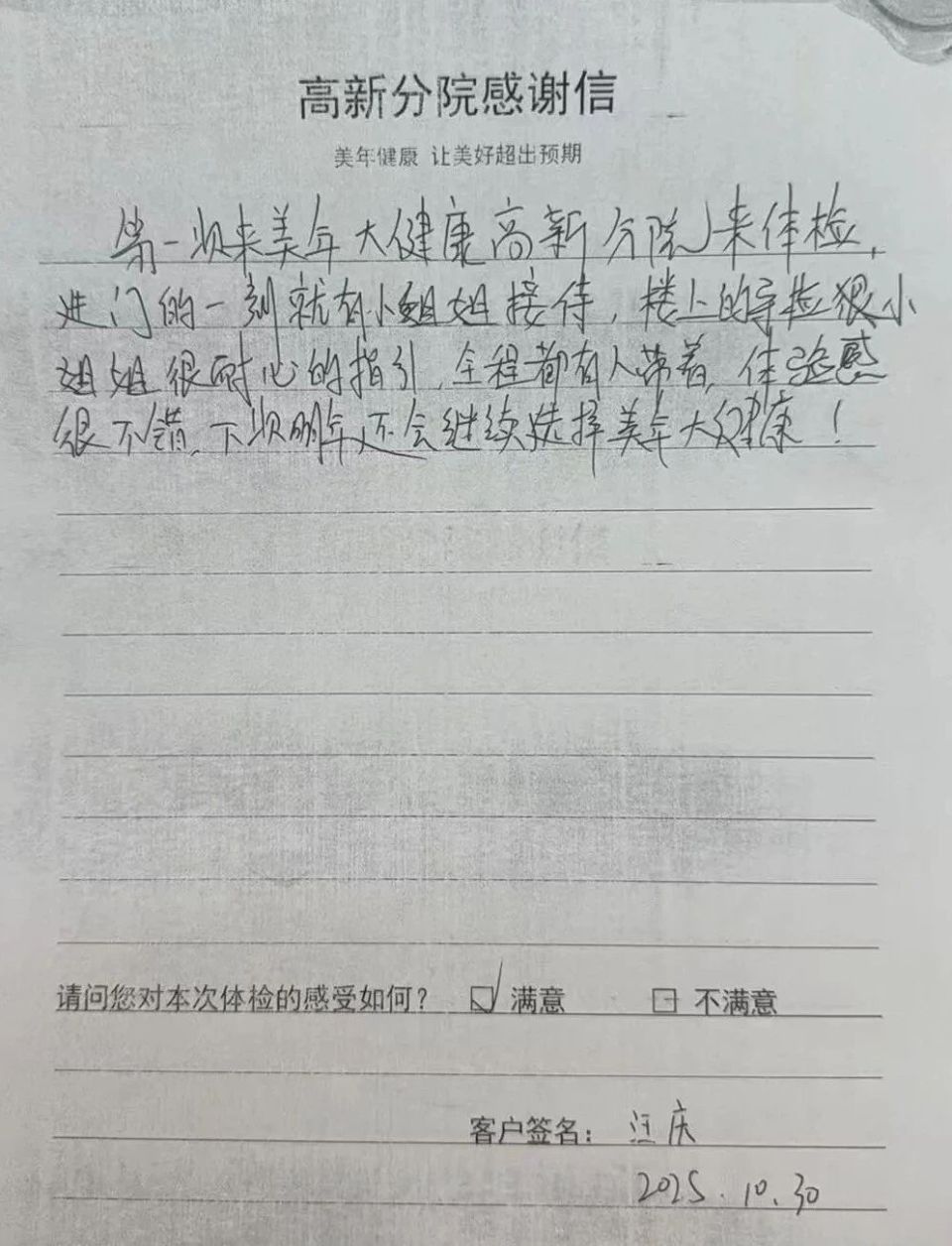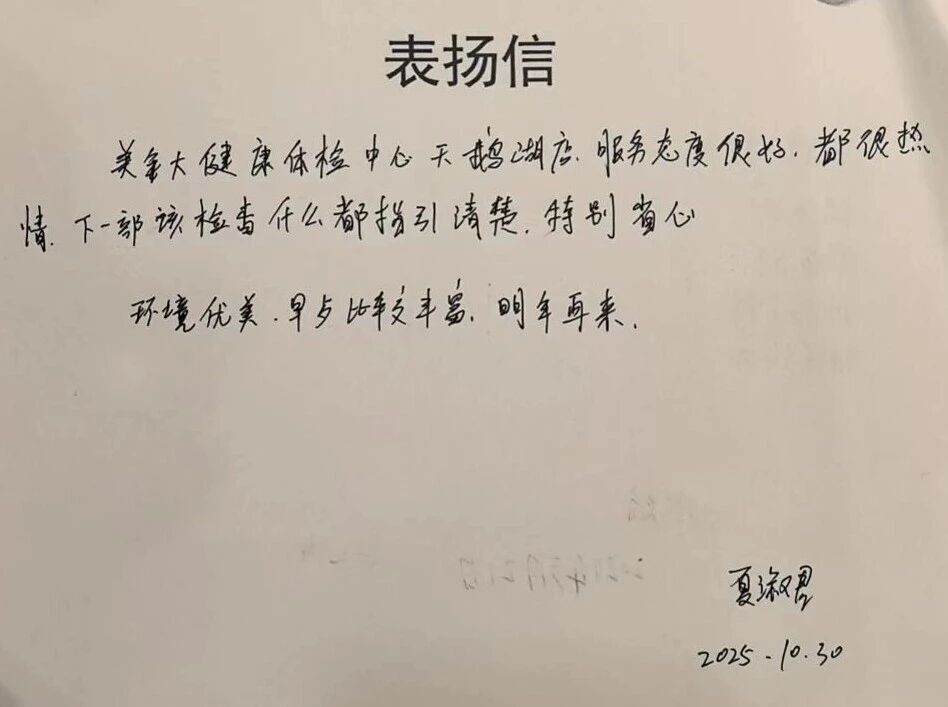 “10 月 25 日的体检,我到现在都记得那种踏实感。”毕女士在信里这样写道。作为合肥美年大健康在庐阳区的核心分院,庐阳分院不仅是周边居民的体检首选,也是合肥企业团检推荐的高频选择,而 “细致服务” 正是它的标签。