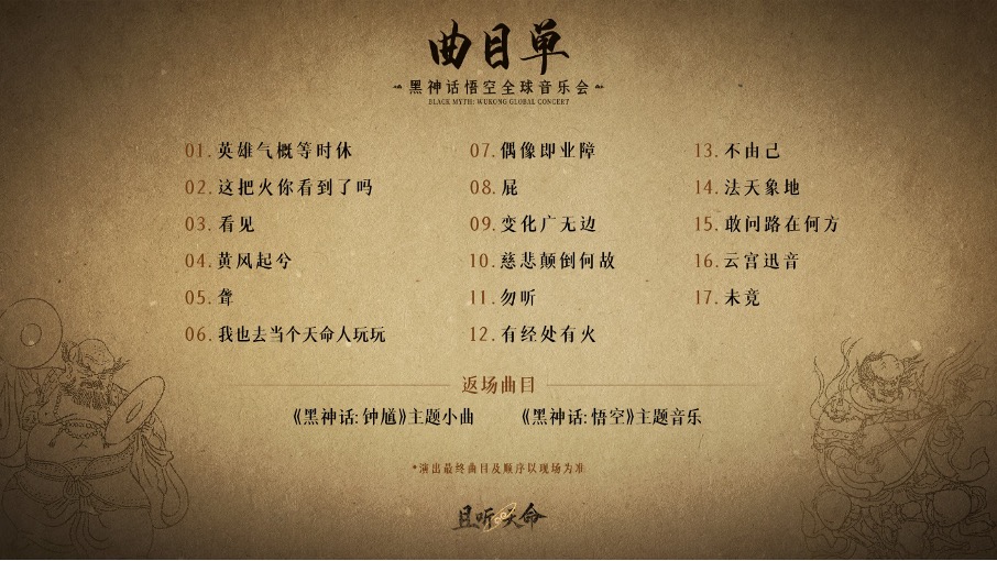 曲目单更新 —— 2026年巡演相比此前的音乐会曲目进行了一定改动,《云宫迅音》和《敢问路在何方》的黑神话改编版将首次加入曲目单。此外,黑神话多首游戏内歌曲的原唱也将加入全球巡演,带来游戏中无二的原唱体验。