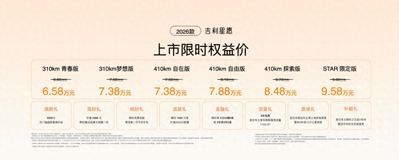 吉利这次是把“性价比”焊在星愿上了——2026款刚上市,我扒完配置直接惊了:续航给够、空间能装、智能还升级,关键限时价才6.58万起,连充电桩都送,这篇咱唠唠闭眼入的理由!